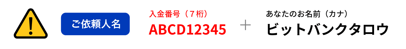 ご入金の際、「振込依頼人名義」項目にて、必ず「入金番号」及びお名前(カナ)を続けてご記入頂く必要があります。