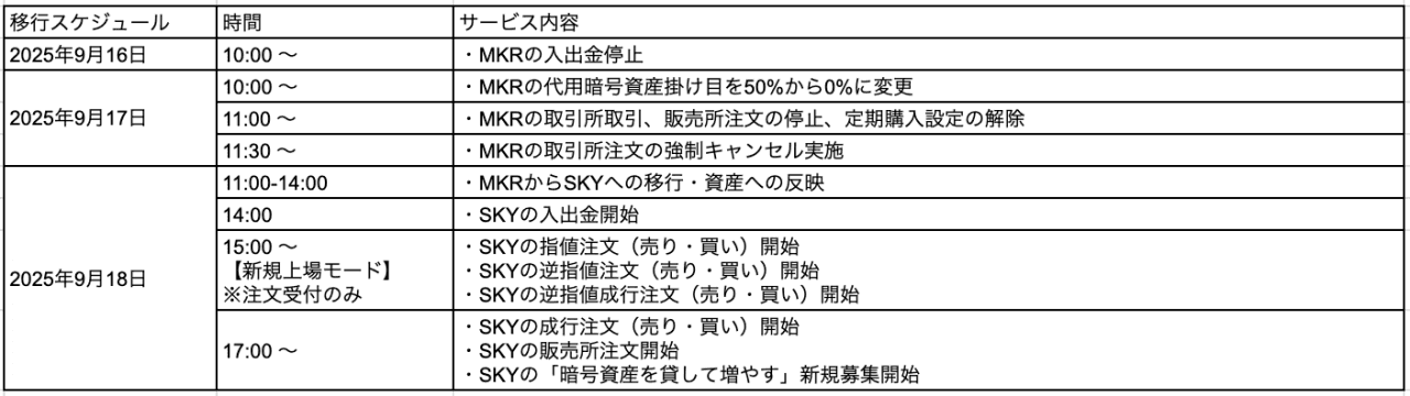 - また、2025年9月17日11:30頃に、MKRの取引所での注文はすべて強制キャンセルされます。お手数をおかけしますが、SKYの注文受付が開始されましたら、改めてご注文いただきますようお願いいたします。
