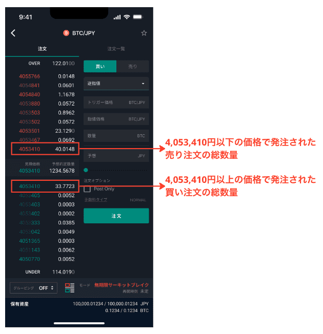 - 板寄せ期間中かつ見積価格が存在する場合、スマートフォンアプリの取引画面上においては以下の表示ルールで板(気配)を表示することとしています。本表示ルールにおいては、実際の発注価格と表示上の価格に差異がある場合がございますのでご注意ください。
