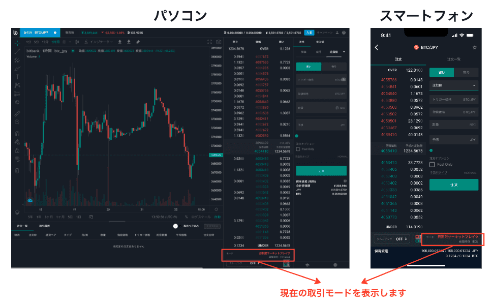 当社では、通常の取引モードに加え、異なる発動条件を持つ4種類のCBモードの計5つのモードが存在しており、ビットバンクが取り扱うすべての取引ペアに対して適用しています。
