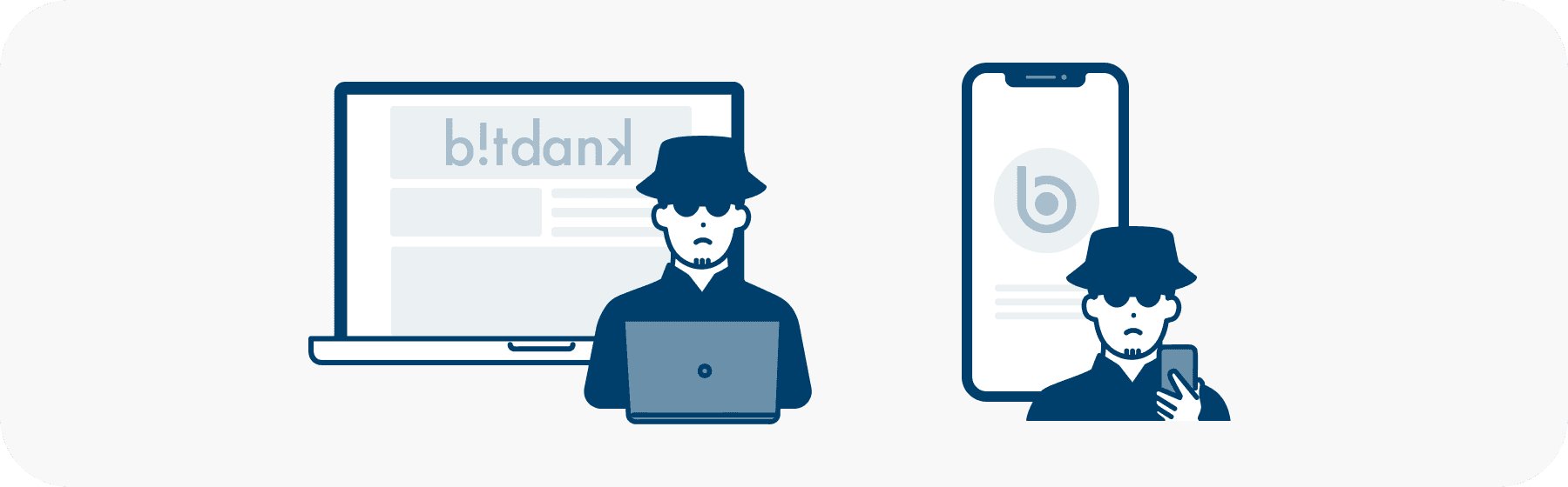 ビットバンクの名を騙る偽サイトやSNSアカウントが確認されています。これらは公式を装い、ログイン情報や個人情報を盗み取ることを目的としています。