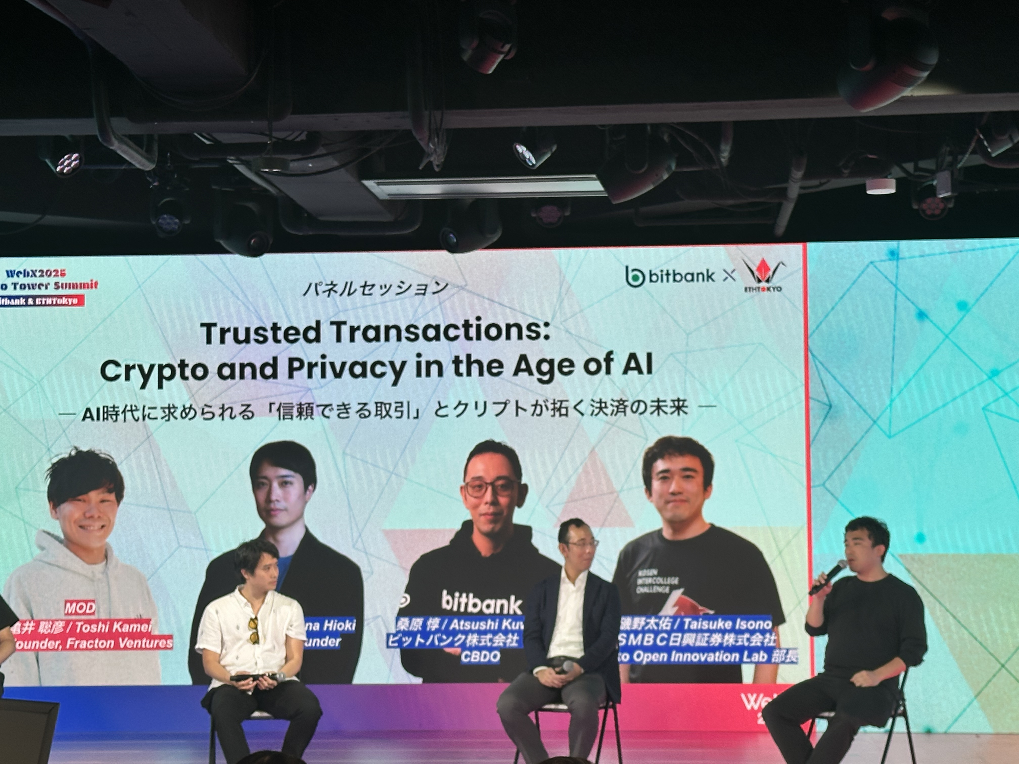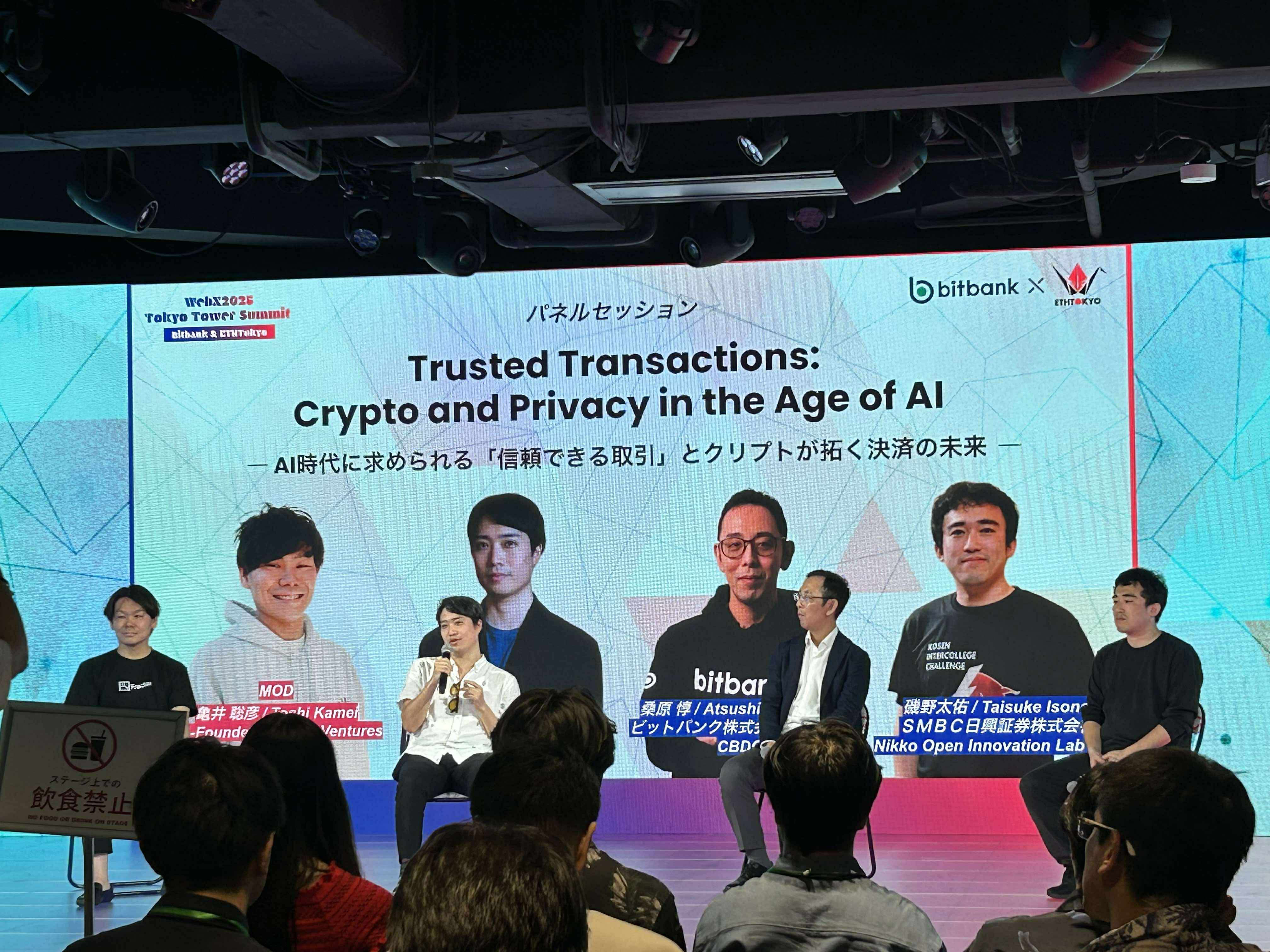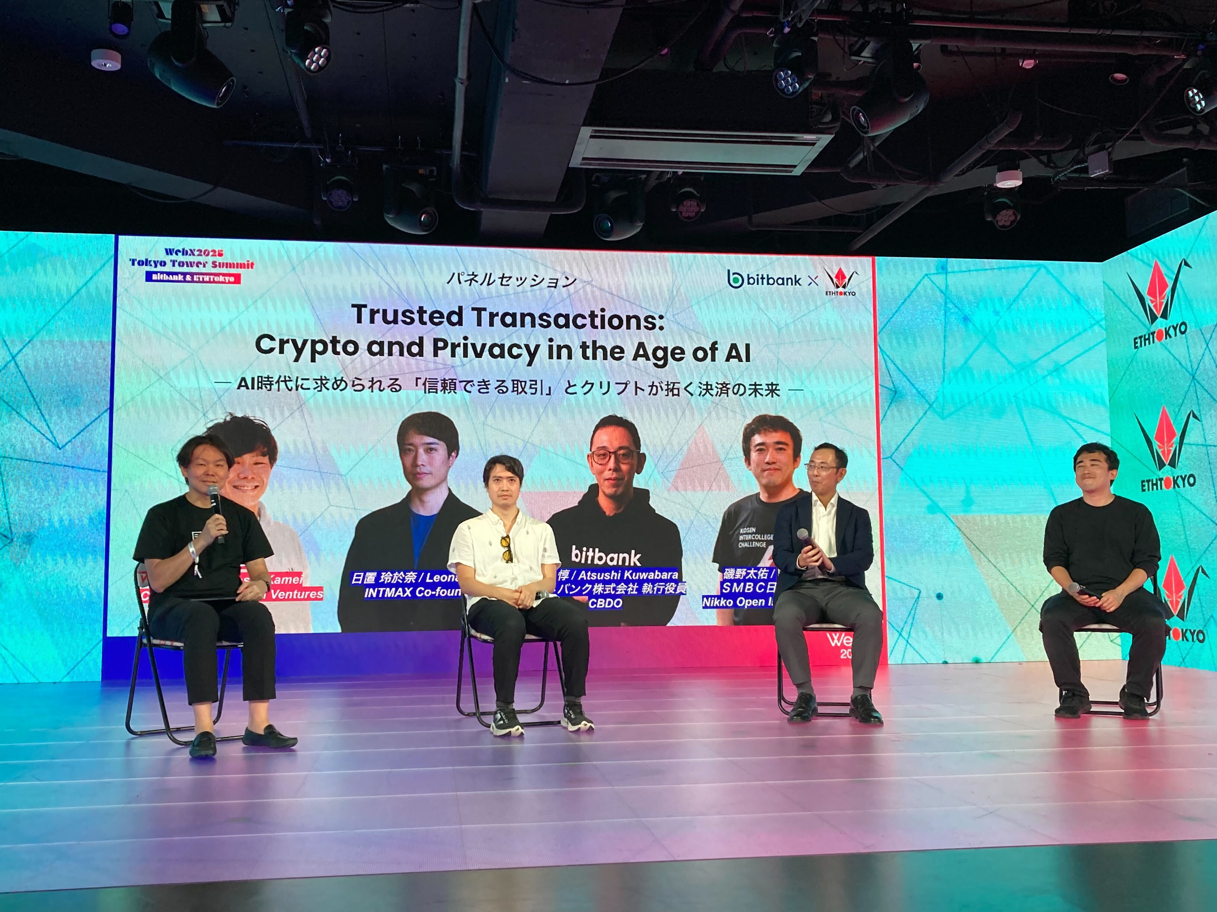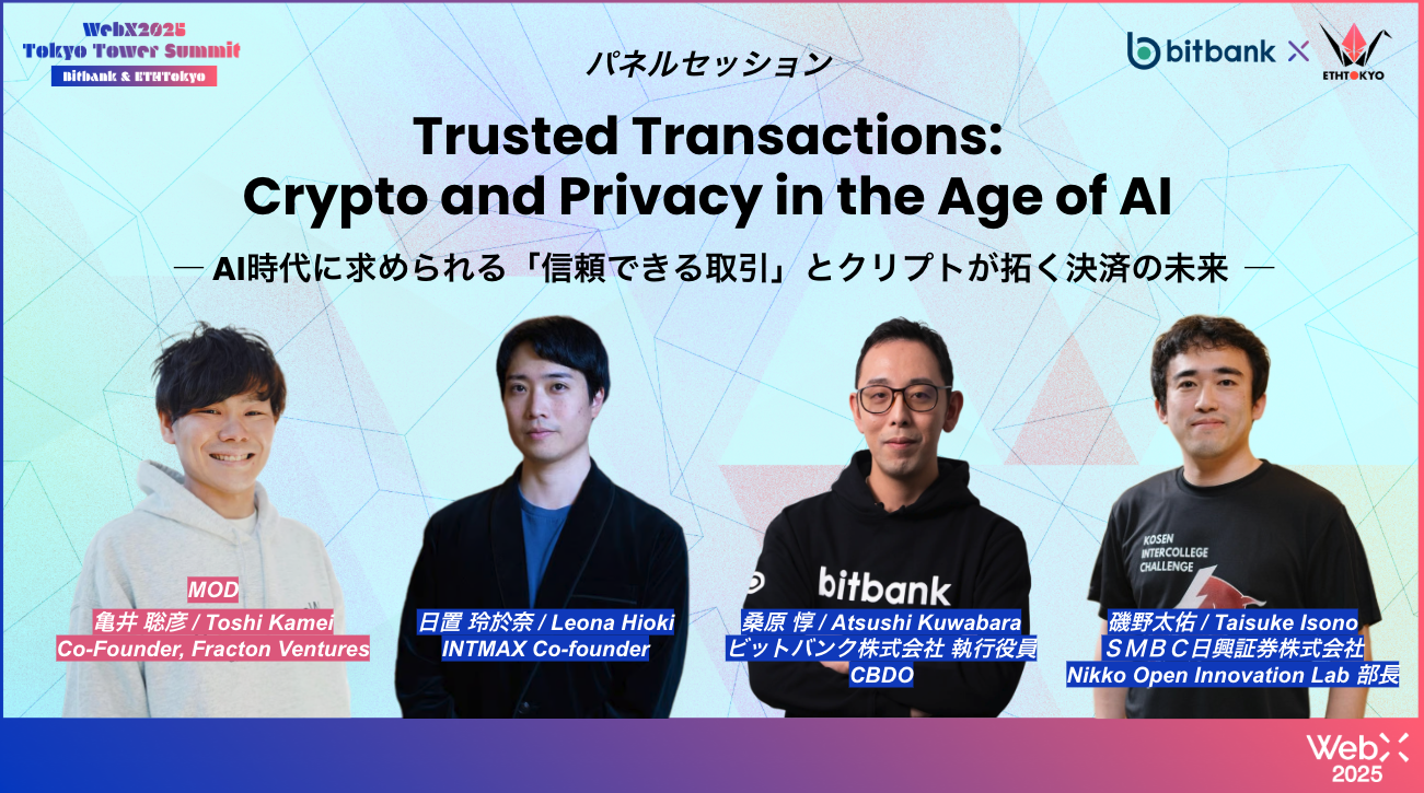 Web3カンファレンス「WebX」のサイドイベントとして、2025年8月26日に東京タワー「RED° TOKYO TOWER」にて『WebX2025 Tokyo Tower Summit - Bitbank & ETHTokyo』を開催しました。その中で行われたパネルセッション「Trusted Transactions: Crypto and Privacy in the Age of AI ― AI時代に求められる「信頼できる取引」とクリプトが拓く決済の未来 ―」の内容について、イベントで司会を務めた竹田(たっけ)がご紹介します。