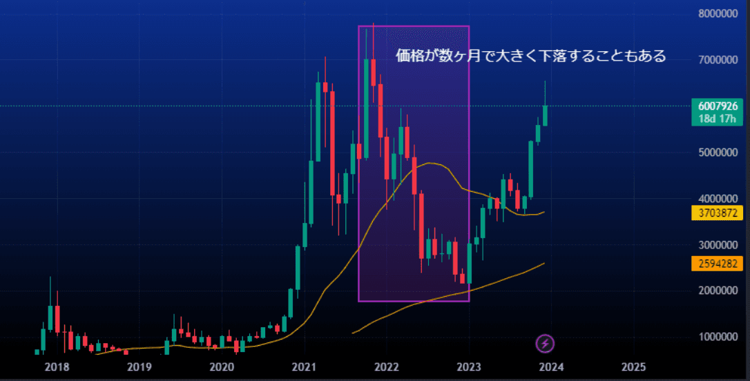 たとえば、以下画像のようにBTCは価格変動が激しく、数ヶ月で50%程度の下落が発生する可能性もあります。