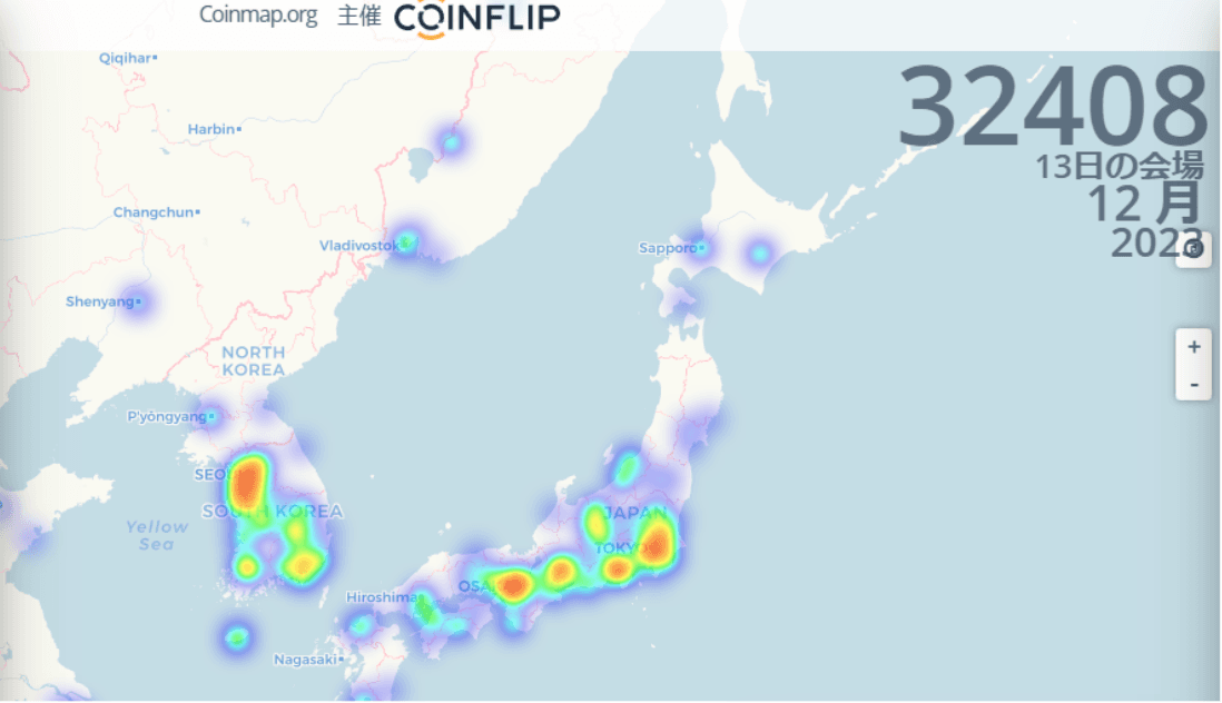 たとえば「coinmap」というアプリは、世界中のビットコイン決済可能店舗が、地図上にマッピングされており、密集地ほど色が赤く表示されます。