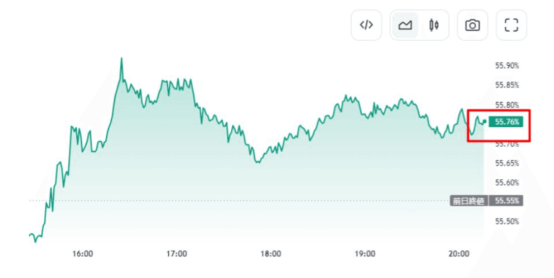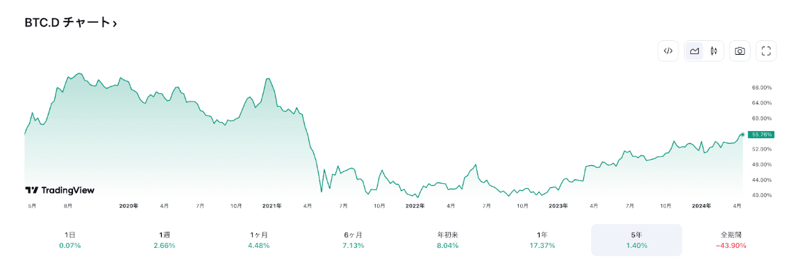 ビットコインのドミナンスは、2024年4月19日時点で約55.8%です。