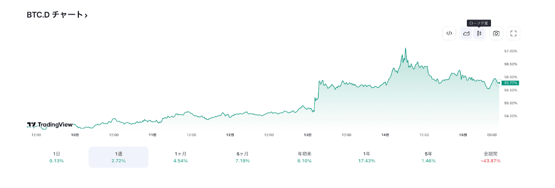 一方で、アルトコインの下落が続くと、投資家がリスク回避のためにビットコインへ資金を移動させるため、ビットコインのドミナンスが上昇します。