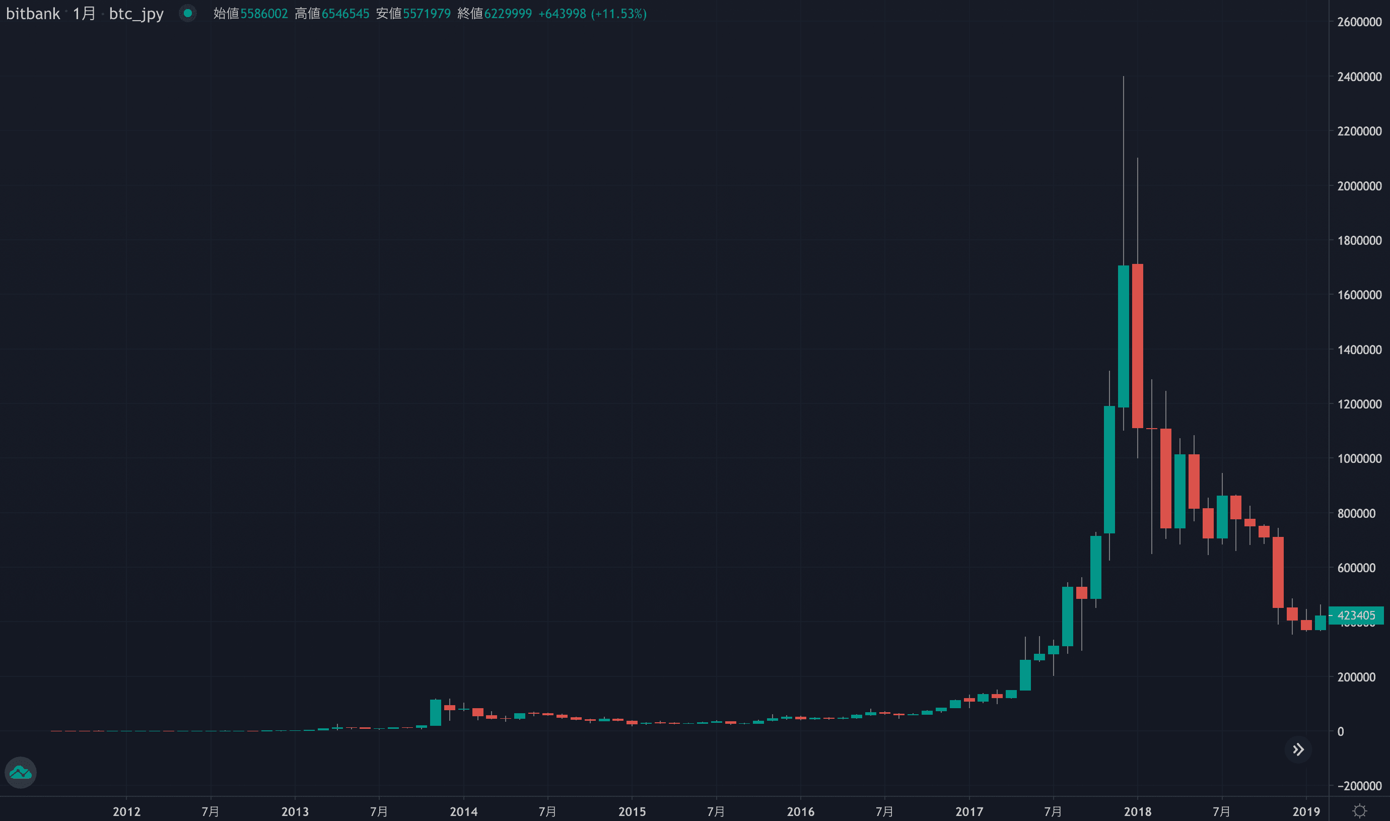 どのくらい価格変動があったのか、当時のビットコイン価格を確認してみましょう。以下はbitbankの2019年までのチャートになります。