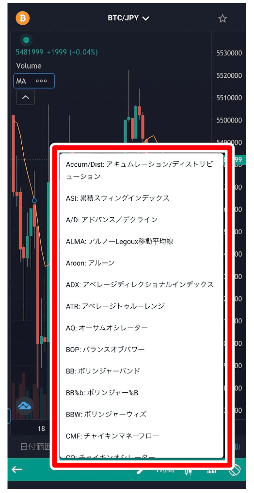 以下の画像は、bitbankのテクニカル指標を選択する画面です。