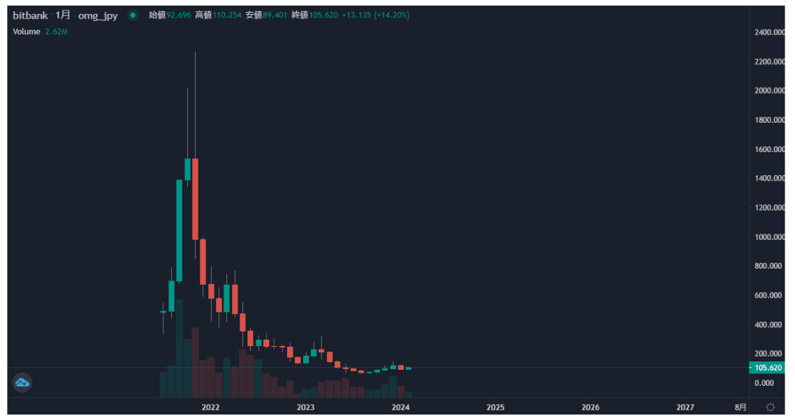 以下画像の通貨は、現在開発が止まっている「OMGコイン」のチャートであり、価格の下落が続いています。