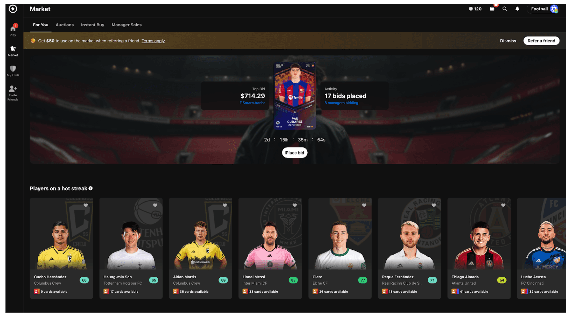 マーケットプレイスとは、NFTカードを取引できるプラットフォームで、Sorareの場合、ゲーム内にマーケットプレイスがあります。