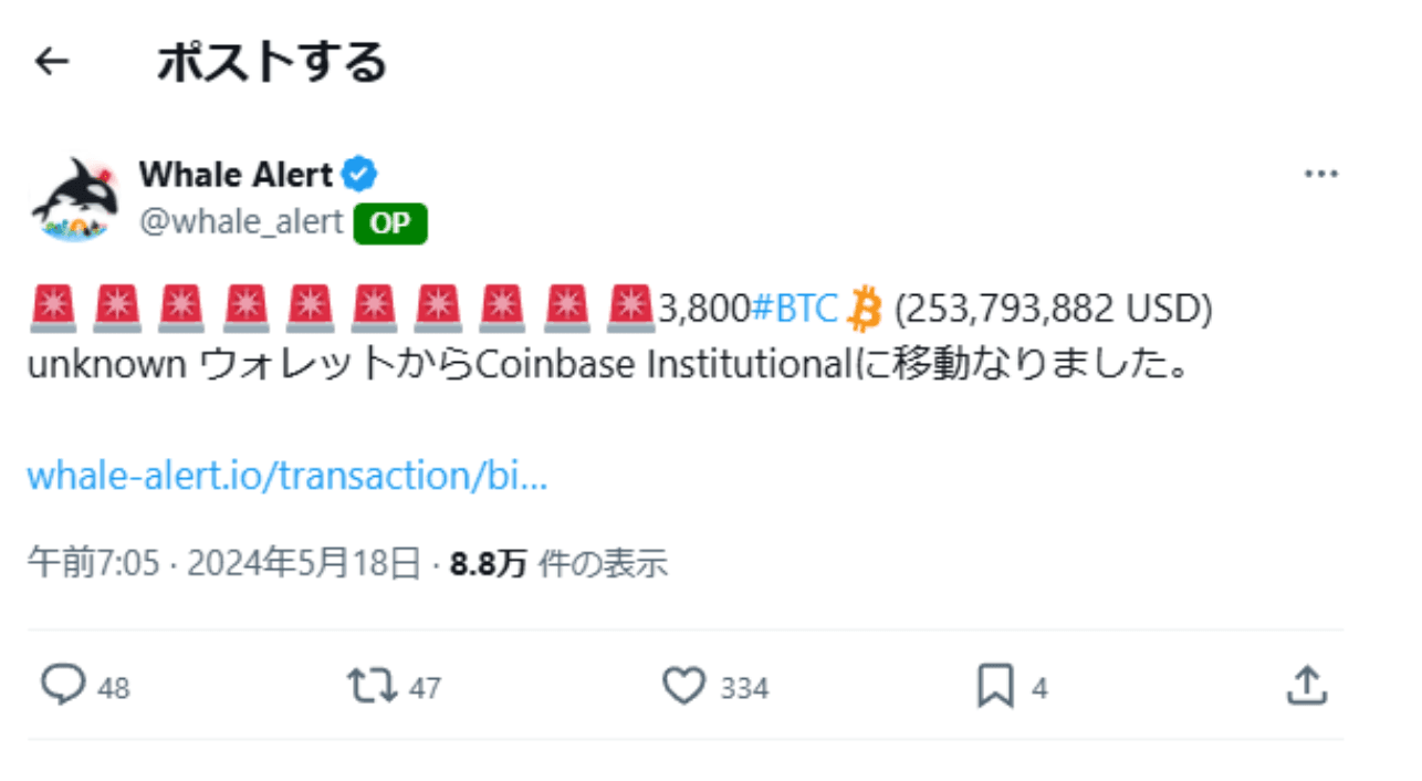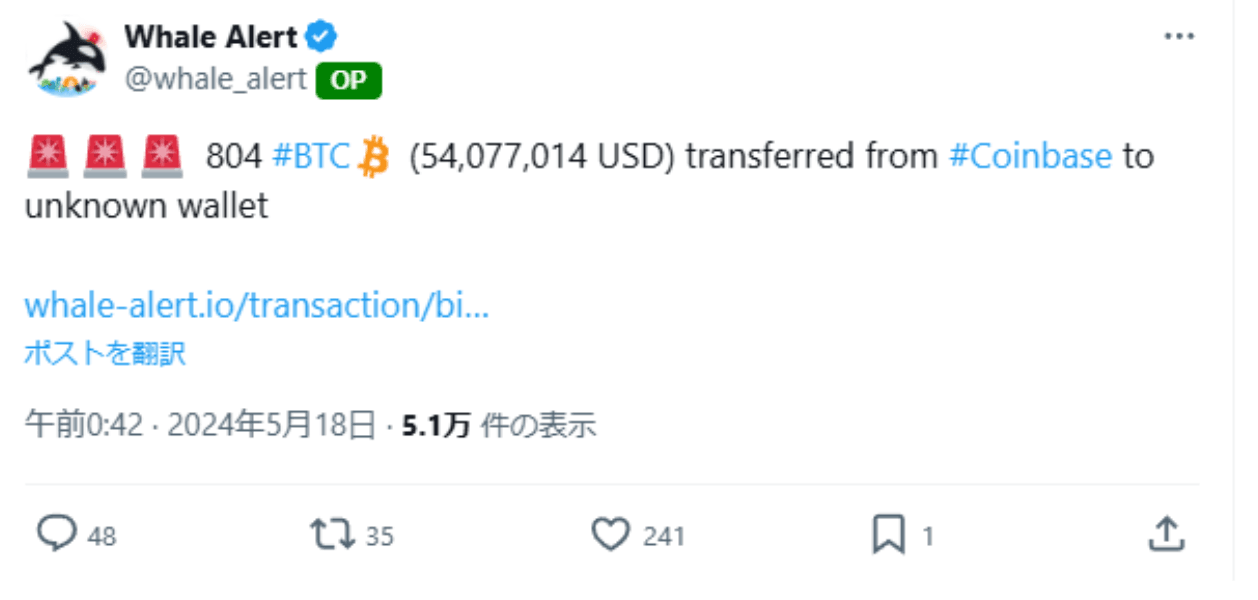 たとえば、2024年5月18日にクジラが取引所からウォレットへ資金移動をしました。ウォレットに資金が移動した場合は、仮想通貨が売却されないため価格は上がりやすくなります。
