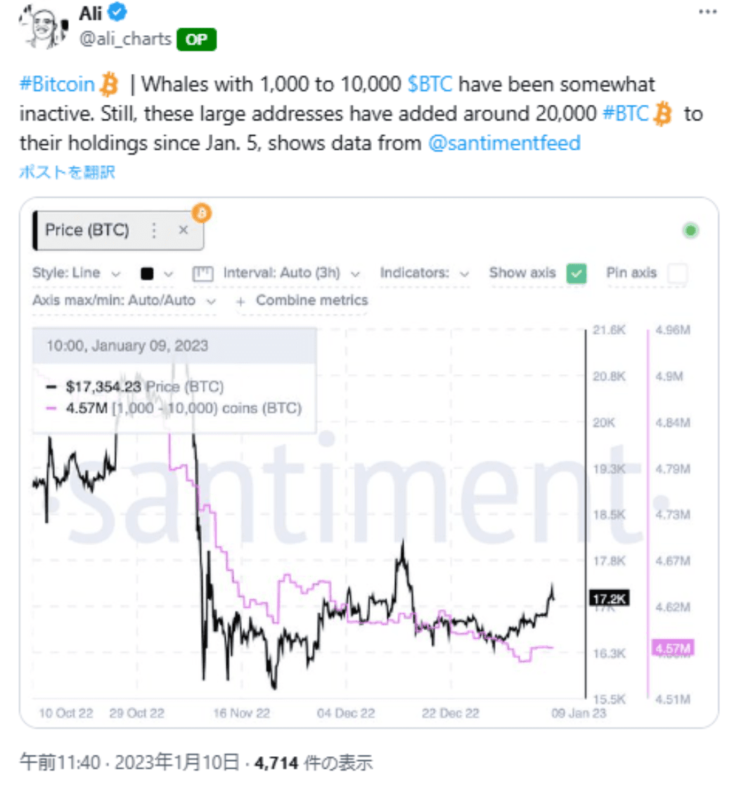 実際に、ビットコイン価格が低迷していた2023年1月当時のポストを確認すると、クジラは約20,000BTCを購入しています。