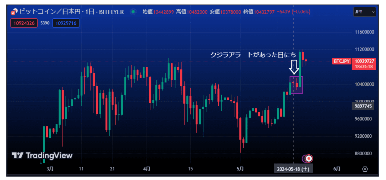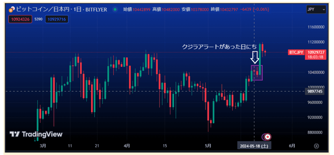 上昇トレンドの一時的な下落中にクジラアラートが入っています。5月18日以降に価格が上昇しているため、上昇トレンド中の押し目と判断できました。