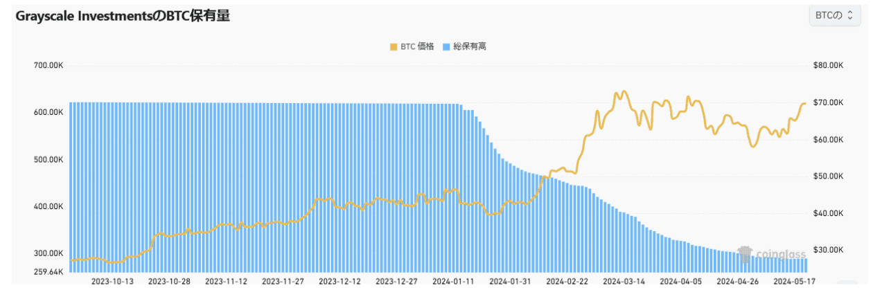 以下の画像からもわかるように、グレースケールはBTC価格の上昇とともに総保有高を減らしています。