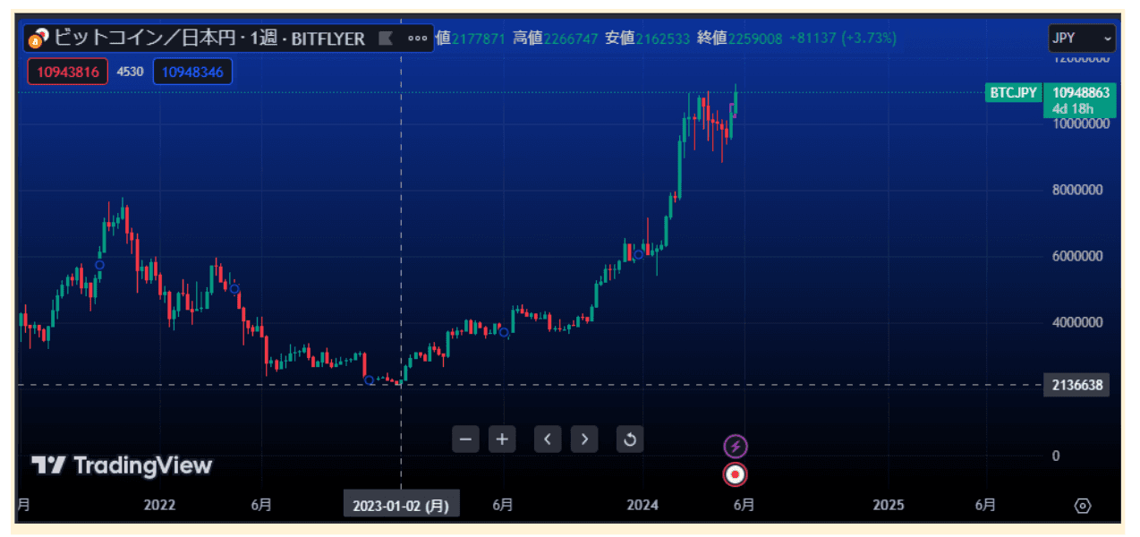 クジラが購入していた2023年1月初めのビットコイン価格は底値であり、以降右肩上がりの価格推移となっています。