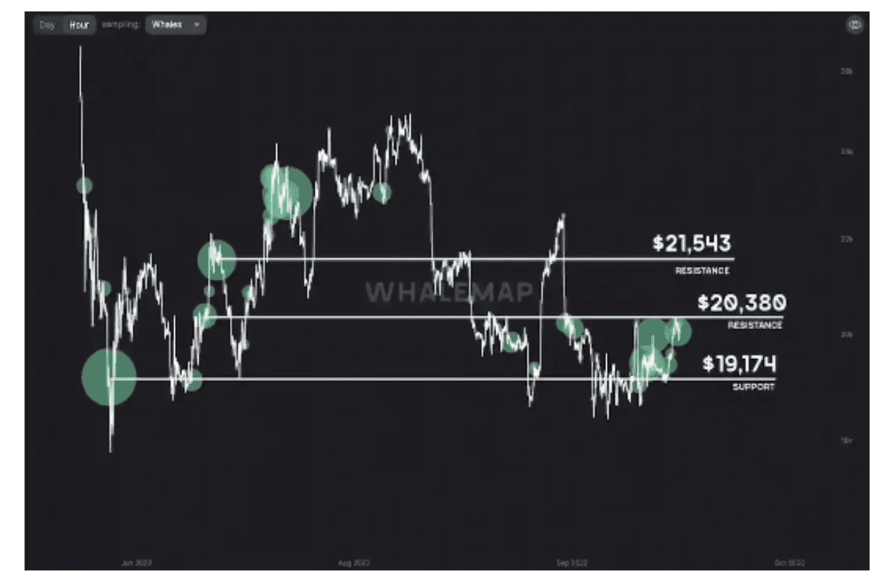 クジラの動向を探る際に覚えておきたい用語が「クジラクラスター」です。クジラクラスターとは、大口投資家がビットコインを売買したあと、ポジションを保有し続けている価格帯のことです。