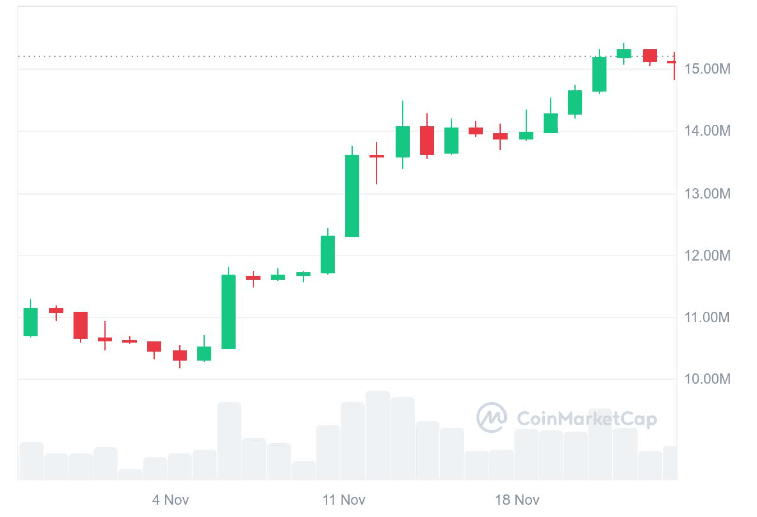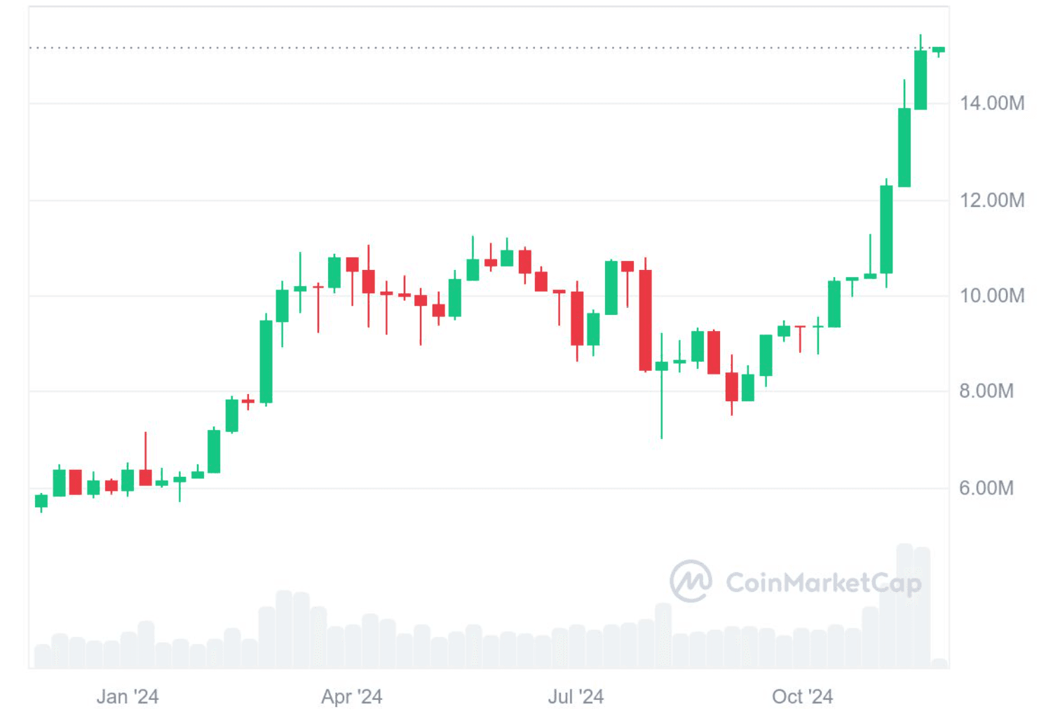 たとえば、半減期を迎えた2024年4月のビットコイン価格は、約1,000万円でした。しかし、2024年11月現在のビットコイン価格は1,500万円を超えており、1BTCあたり500万円も値上がりしています。