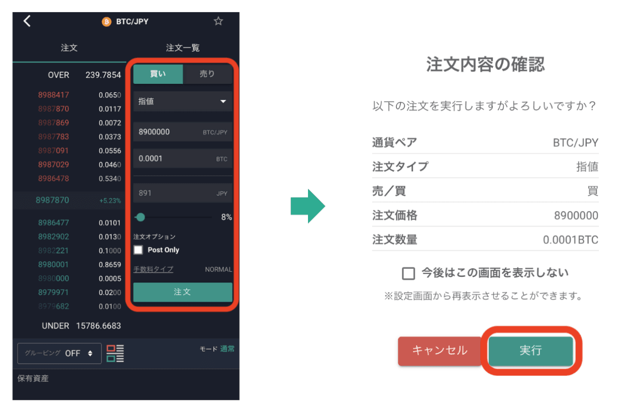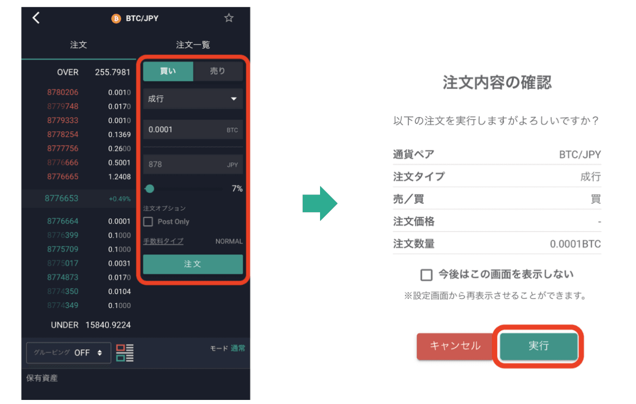 予想購入額に問題がなければ注文ボタンを押し、買い板を市場に出します。確認画面が表示されるので、問題なければ「実行」をタップしましょう。