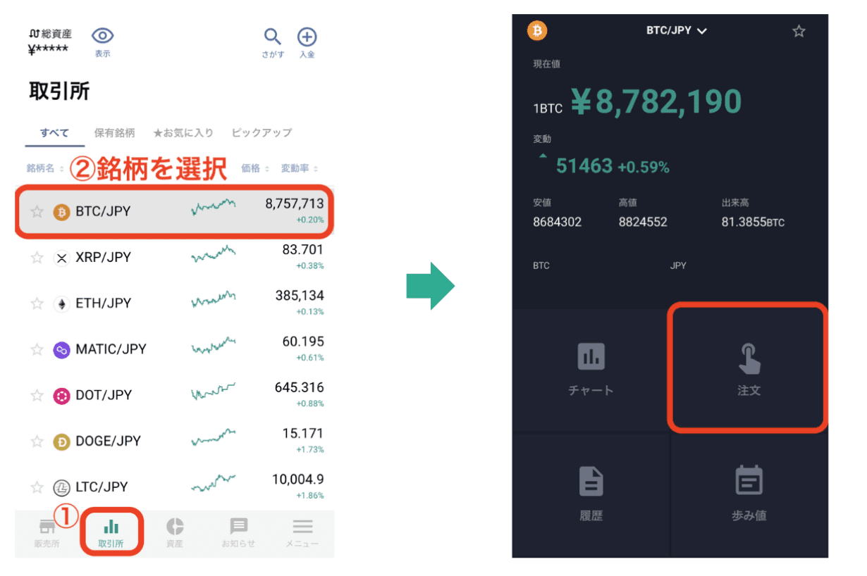 成行注文での買い方、まず指値注文と同様に、ホーム画面から「取引所」をタップし、購入したい銘柄を選択します。続いて「注文」をタップします。