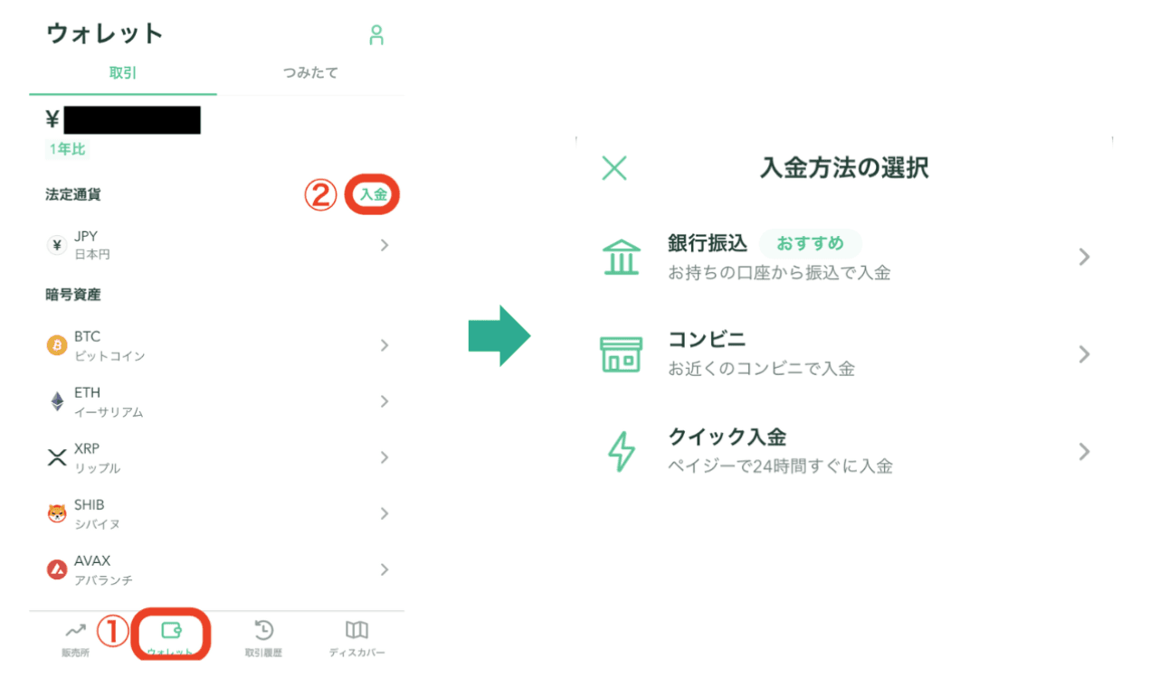 - ウォレット画面が開くので、法定通貨の「入金」をタップ