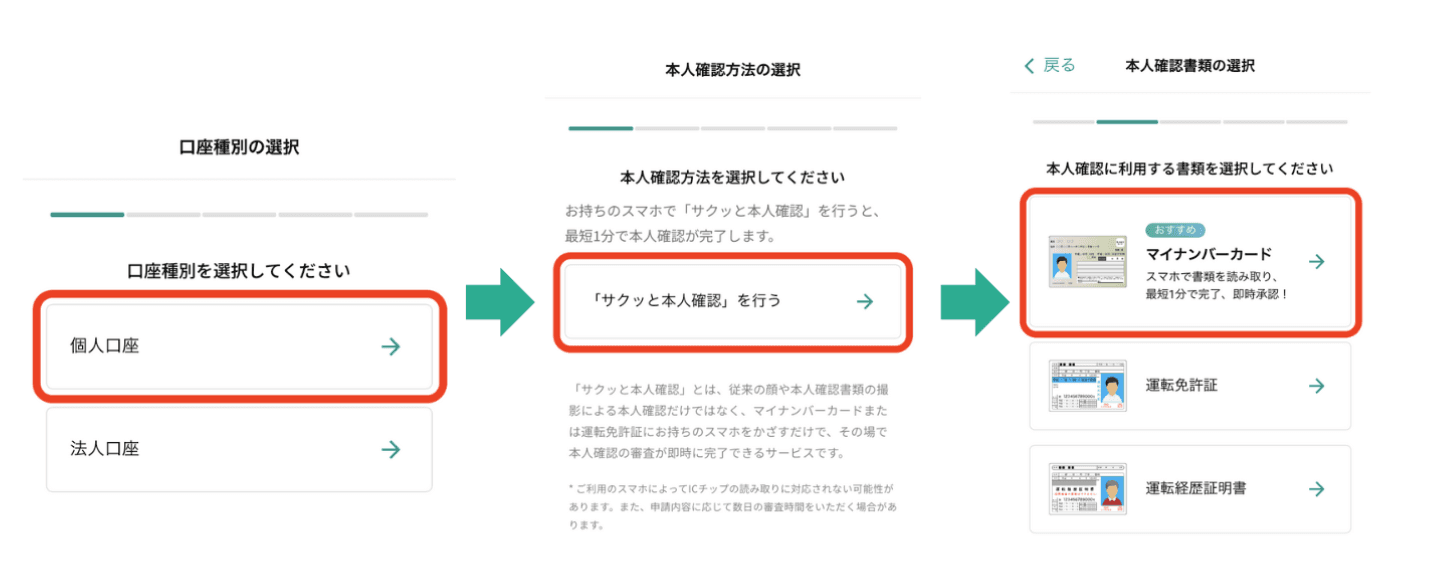 最後に、本人確認書類の選択を行います。マイナンバーカードなら、以下の手順ですぐに取引開始できます。
