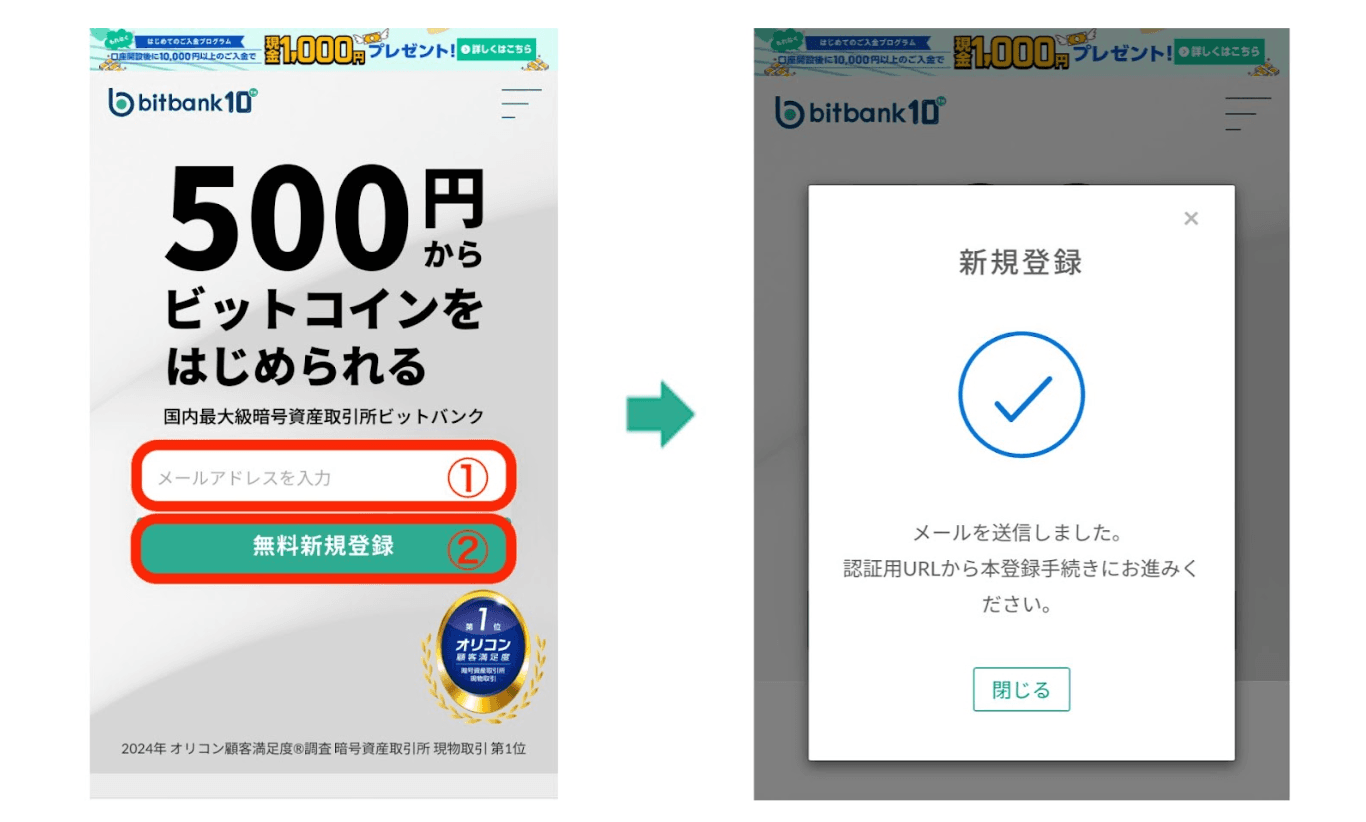 まずは、bitbankの公式HPからメールアドレスの入力を行い、「無料新規登録」をタップしましょう。登録ボタンをタップすると、登録したメールアドレス宛にbitbankからメールが届きます。