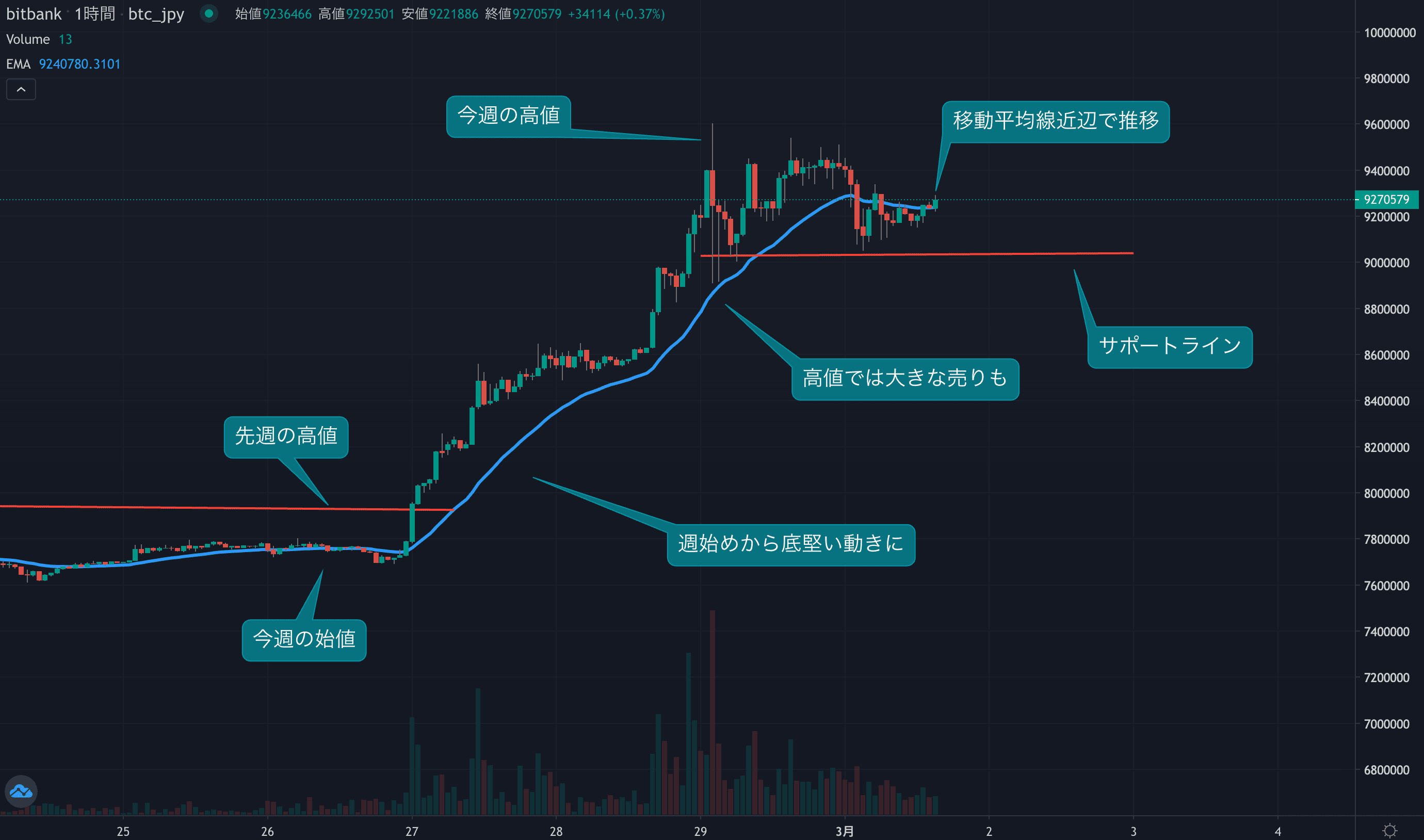 - 今週のビットコインは2月26日の777万円から取引が始まりました。相場は月曜日のアメリカ時間から上昇し始め、先週の高値を超えると買いが殺到しました。火曜日も午後から上昇し始め、底堅い動きになりました。買いは水曜日まで続き、価格は一時960万円にタッチ。一方、高値圏では米取引所のコインベースのシステムがシャットダウンしてしまうアクシデントがあり利確売りに繋がりました。価格は高値から890万円まで下落し、70万円近くも急落する動きがありました。コインベースは注文の集中がシステムのダウンを引き起こしたと説明しています。週後半に入ると相場は徐々に落ち着き、価格は24時間移動平均線近辺(24EMA)で推移しています。今週は大きく上昇した反面、大量の利確売りも確認されています。900万円のサポートラインを割り込むと高値警戒が意識される動きとなるでしょう。