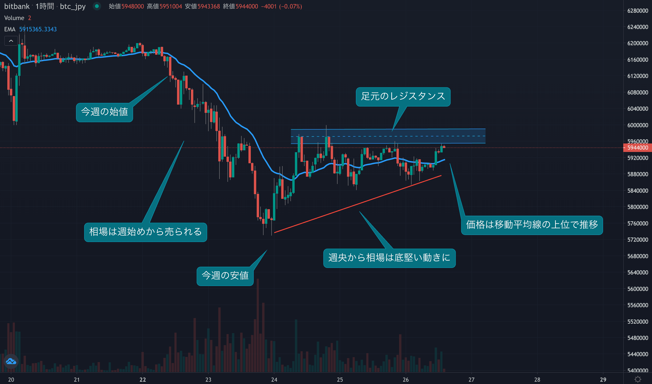 - 今週のビットコインは1月22日の615万円から取引が始まりました。今週は先週の下落の流れが継続し、週始めから強く売られました。火曜日には572万円まで下落し、これまでサポートされていた600万円を大きく割り込みました。570万円台を記録した後は、買い戻しが入り相場は底堅さを取り戻します。週央からは安値を切り上げる動きとなり、現在も24時間移動平均線(24EMA)を上回っています。現在は594万円で取引されており、600万円近辺の足元のレジスタンスに近づいています。短期的には600万円を回復できるか否かは、非常に重要な値動きとなり、600万の上位に浮上することができれば来週以降も底堅い動きが期待できます。