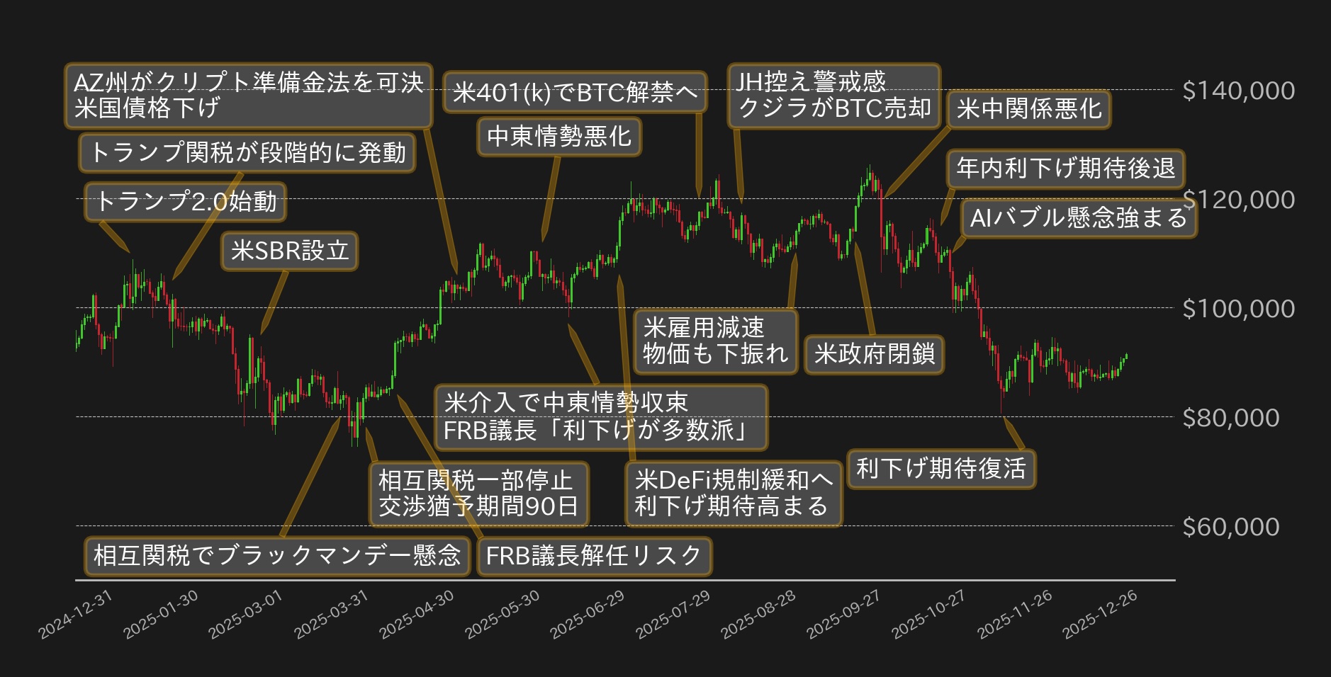 しかし、同日には米ニューヨーク地区連銀のウィリアムズ総裁が、利下げを「近い将来」に実施できると発言したことで、市場は急速に12月米連邦公開市場委員会(FOMC)での利下げを織り込み、BTCは下げ止まった。12月には、一時9万4000ドル台まで戻すも、米株式市場でのAIバブル懸念は払拭されず、9万ドル台の維持には失敗。年末には取引材料に乏しい中、8万8000ドル周辺での取引が続いた。