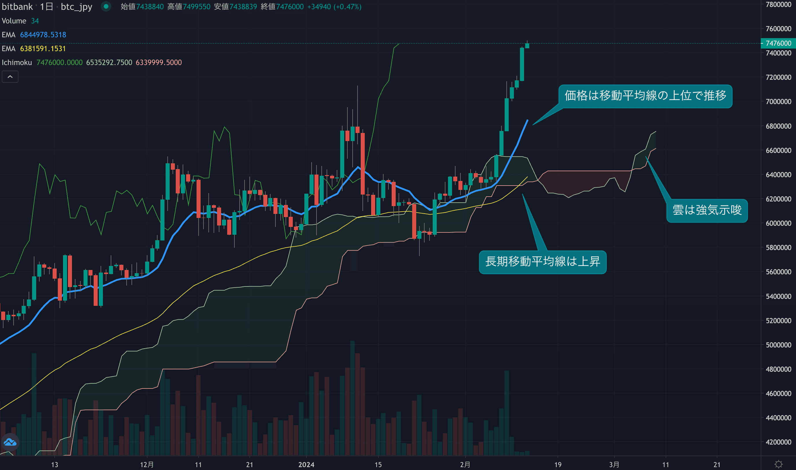 - 昨日のビットコインは3.3%上昇し、終値は743.8万円でした。相場は週末も底堅い動きとなり、週末2日間に加え月曜日もプラスで取引されました。先週からの連続陽線は8日となりました。1月の710万円近辺の高値も超えており、非常に強い値動きとなっています。