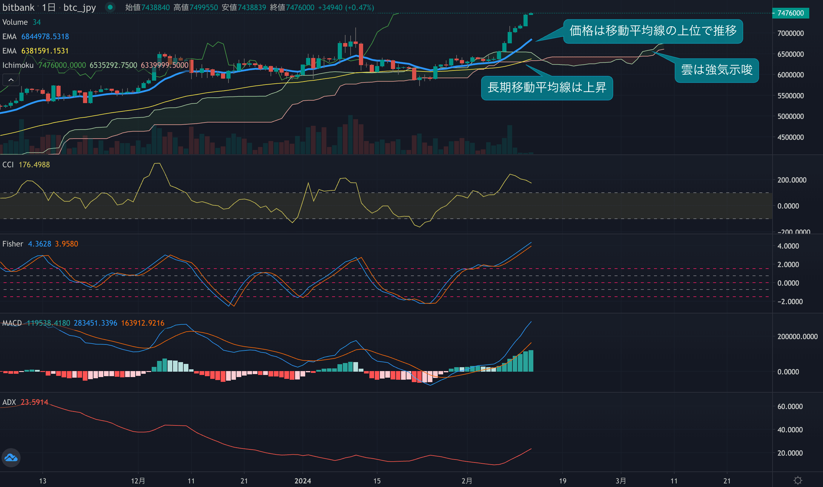 - オシレーターは全てプラス圏で上昇しています。CCIは高値を更新し193で推移。Fisherはプラス圏で遅行線を上回っています。長期オシレーターのMACDも上昇が継続し、強気のモメンタムを示しています。