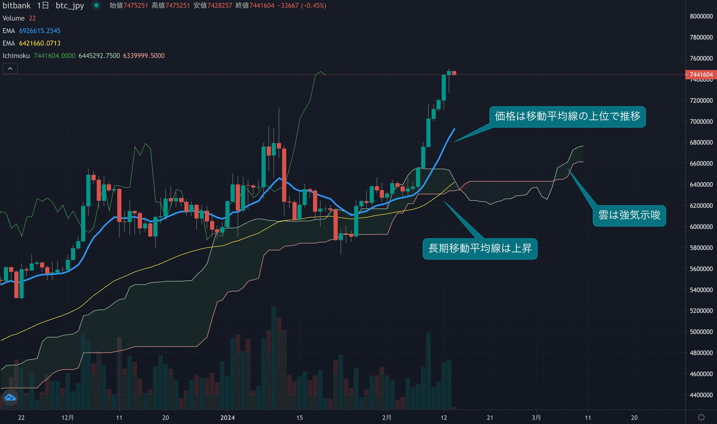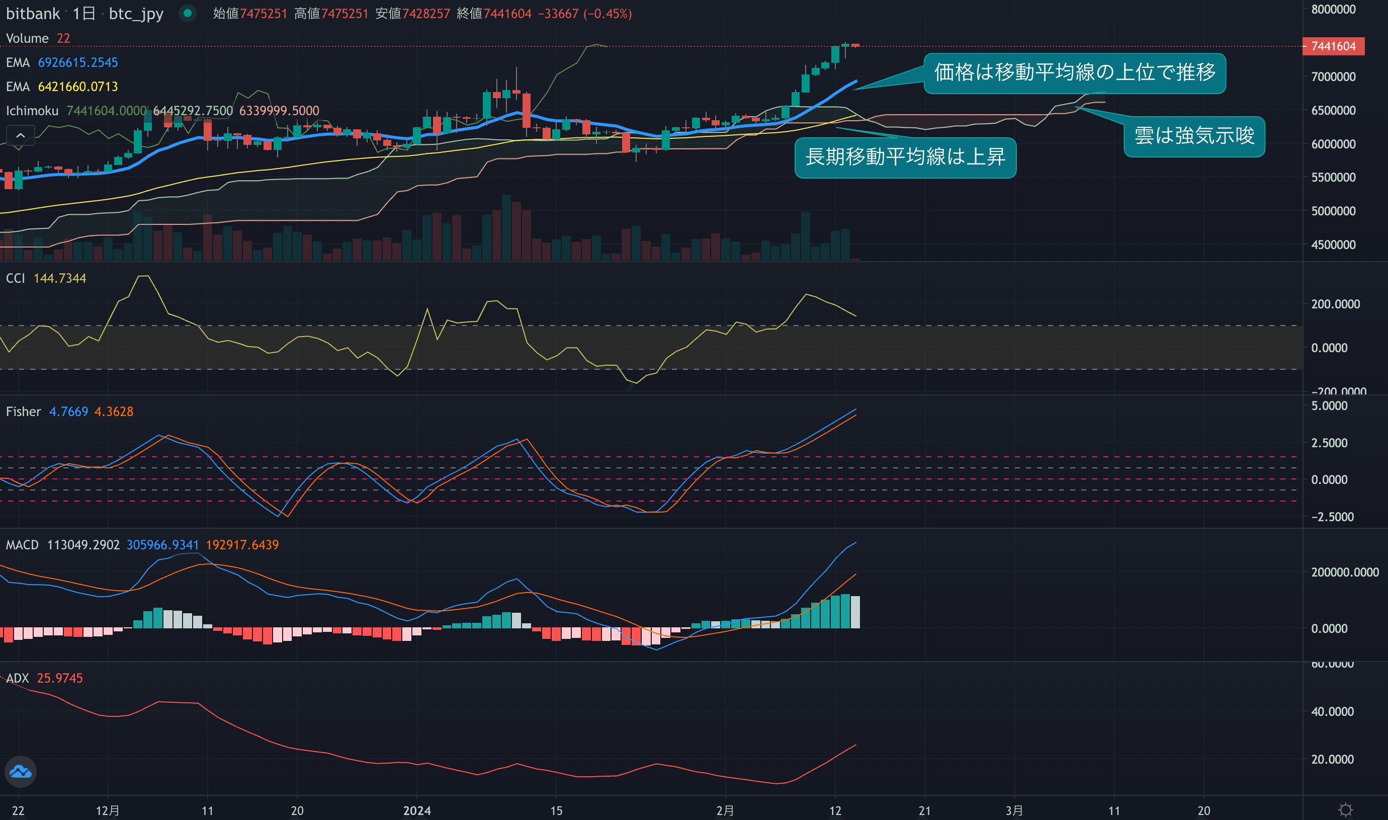 - ビットコイン相場は先週から買いが先行する動きとなっています。昨日は高値から3%近く下落したところから買い戻しが入りました。引き続き日足は移動平均線から乖離しており、高値警戒が必要ですが、今週後半も短期トレードでは押し目買いを狙うことになるでしょう。長期では対円の過去高値更新も現実味を帯びてきています。bitbankでは2021年11月に記録した779万円が過去最高値となっています。昨日は円安が進み、ドル円が150円台を回復したことで、ビットコインの対円もプラスとなりました。今後も弱い円がビットコイン相場を後押しする可能性があり、過去最高値の更新は時間の問題でしょう。