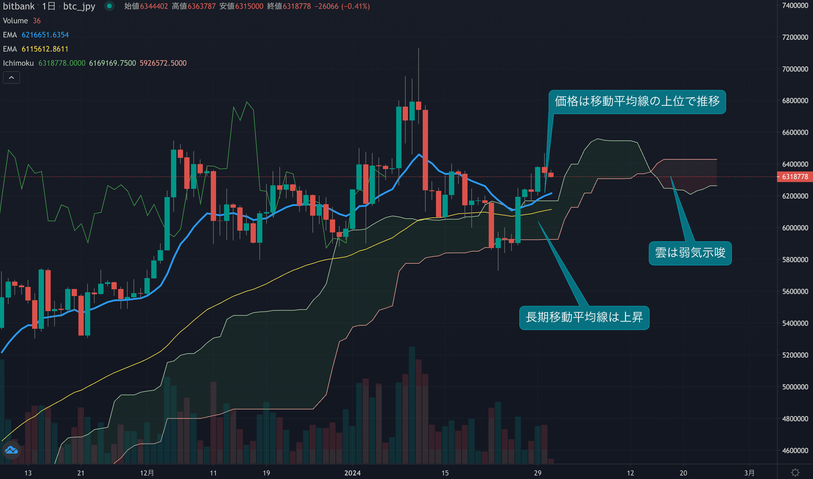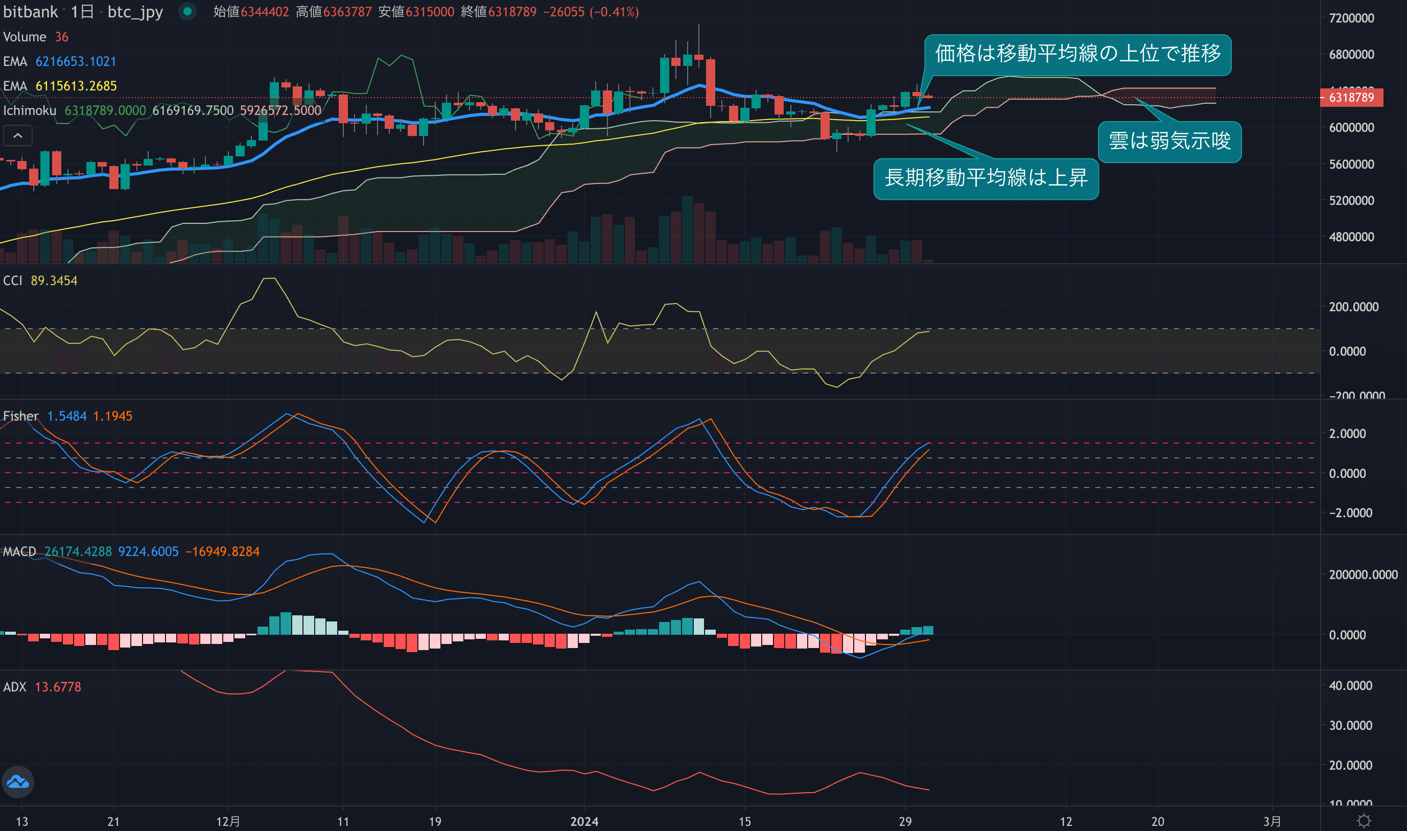 - 価格は14EMA(620.0万円)を上回り強気示唆です。53EMA(614.8万円)は上昇しており、長期トレンドも強気です。一目均衡表の雲は先行スパン1(626.4万円)が先行スパン2(643.0万円)を下回り弱気示唆です。
