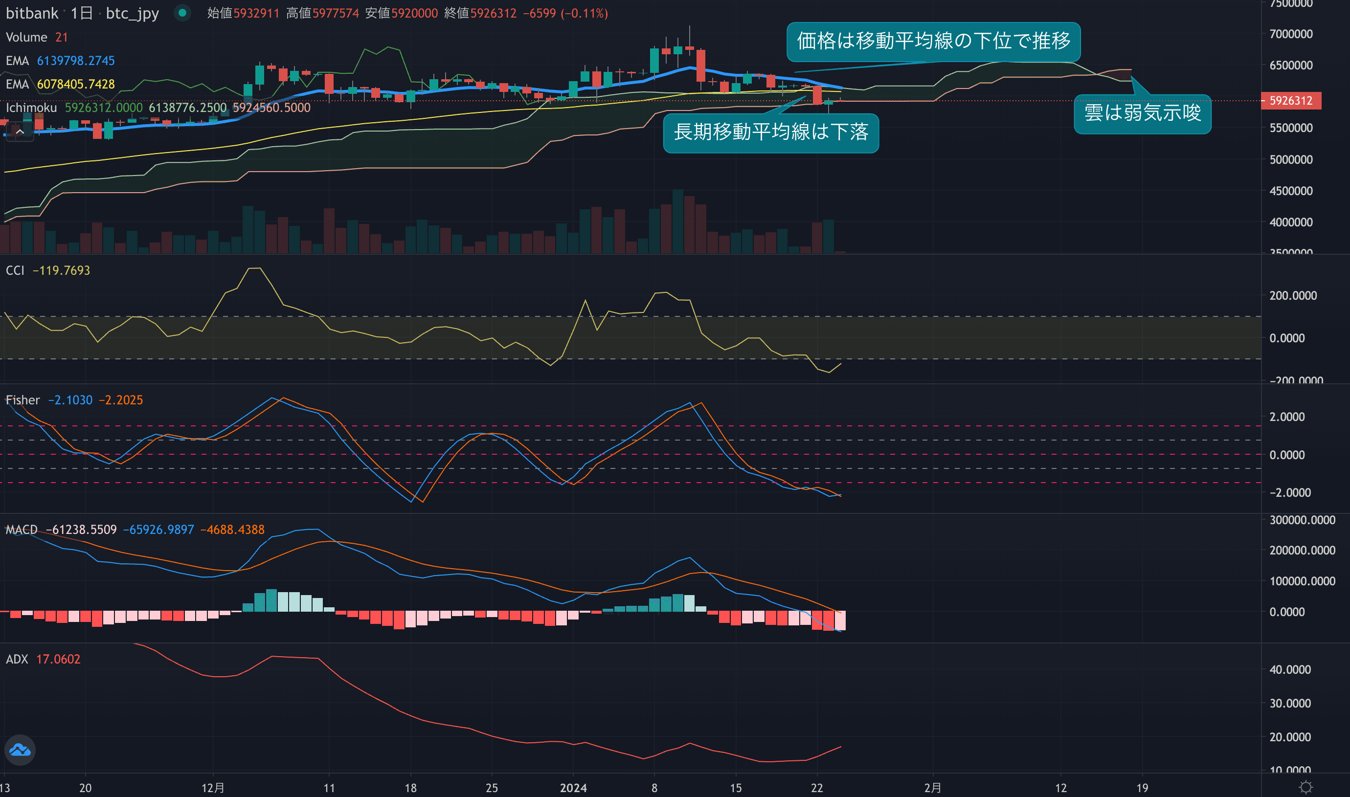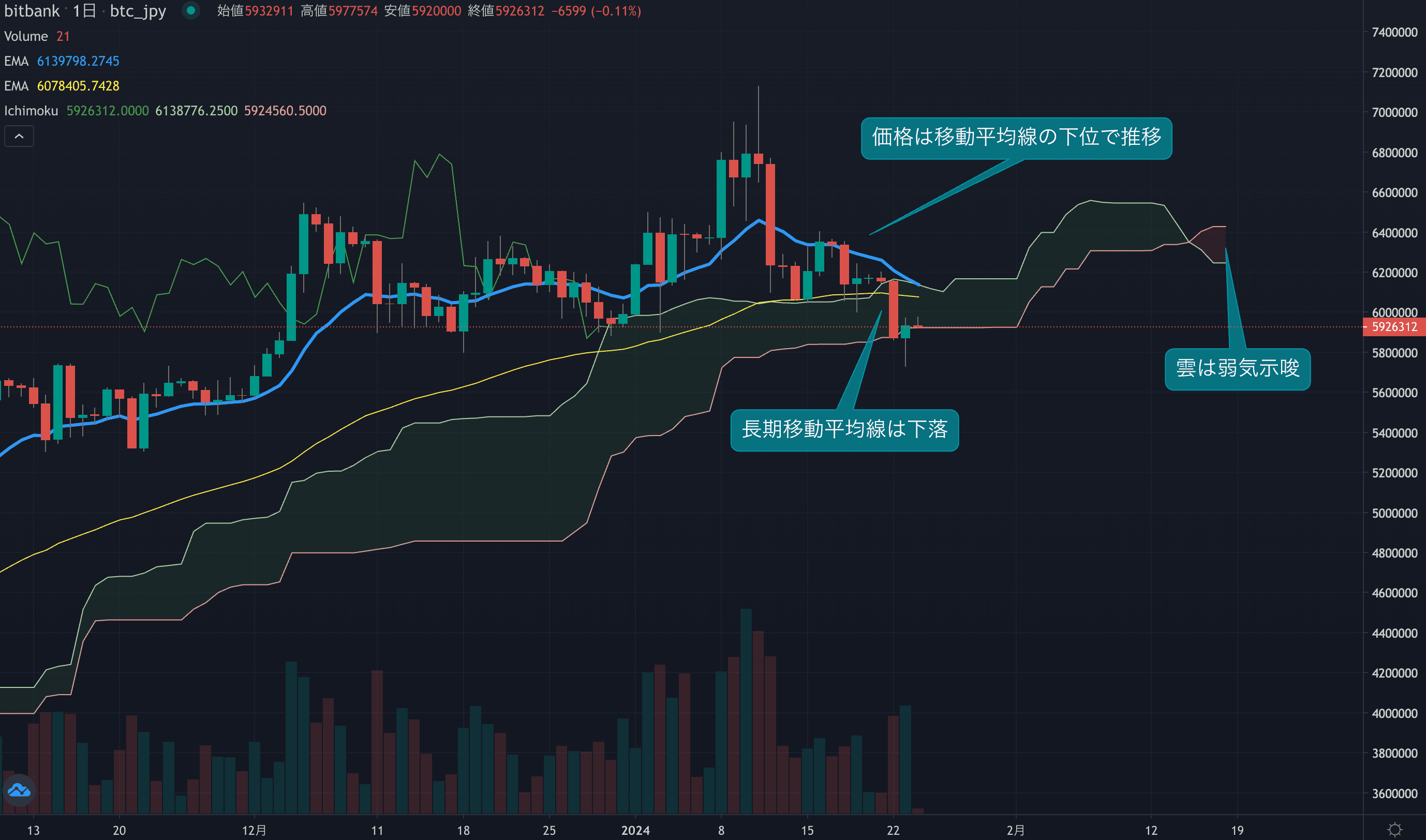 - 価格は14EMA(617.2万円)を下回り弱気示唆です。53EMA(608.4万円)は下落しており、長期トレンドも強気です。一目均衡表の雲は先行スパン1(624.8万円)が先行スパン2(543.0万円)を上回り強気示唆です。
