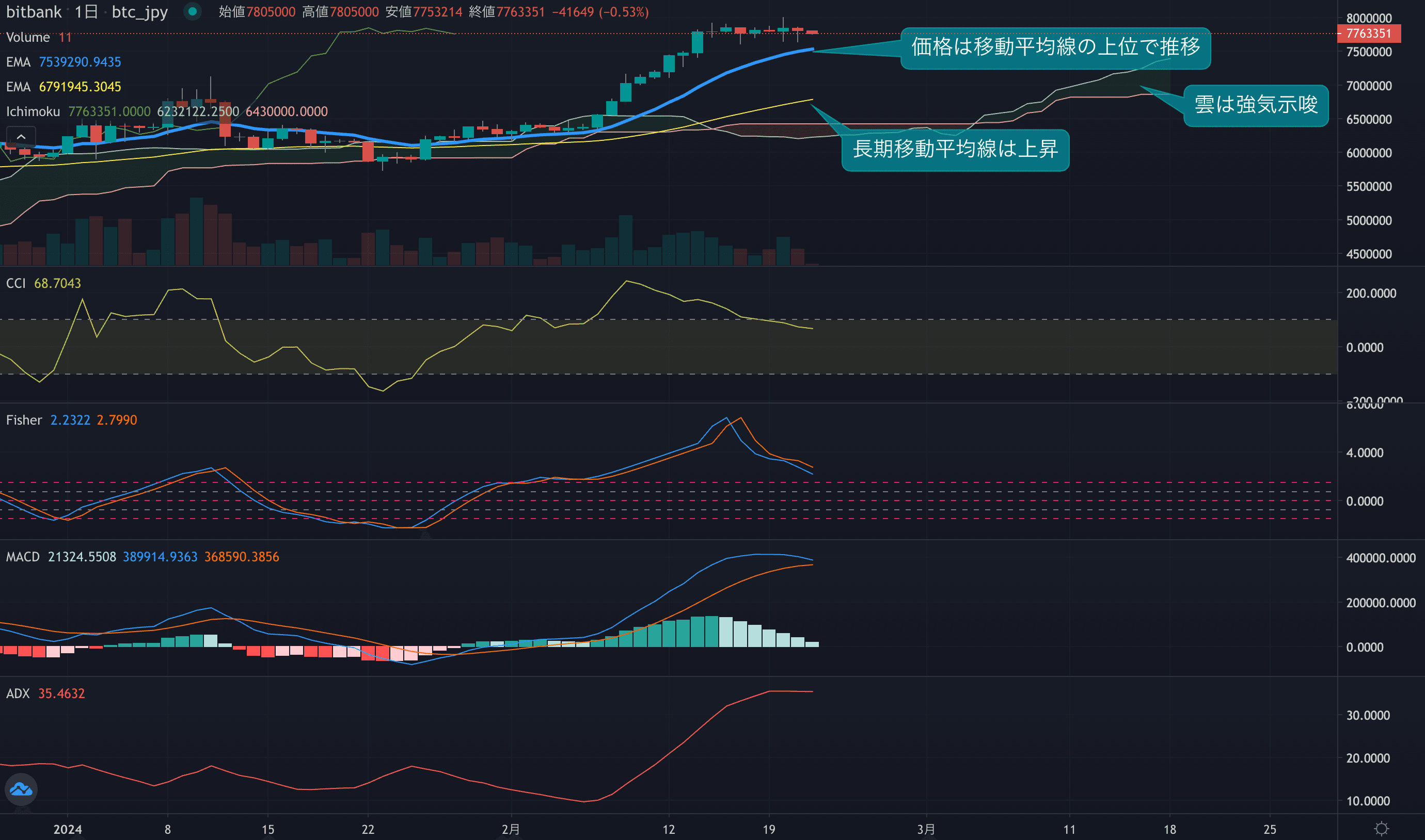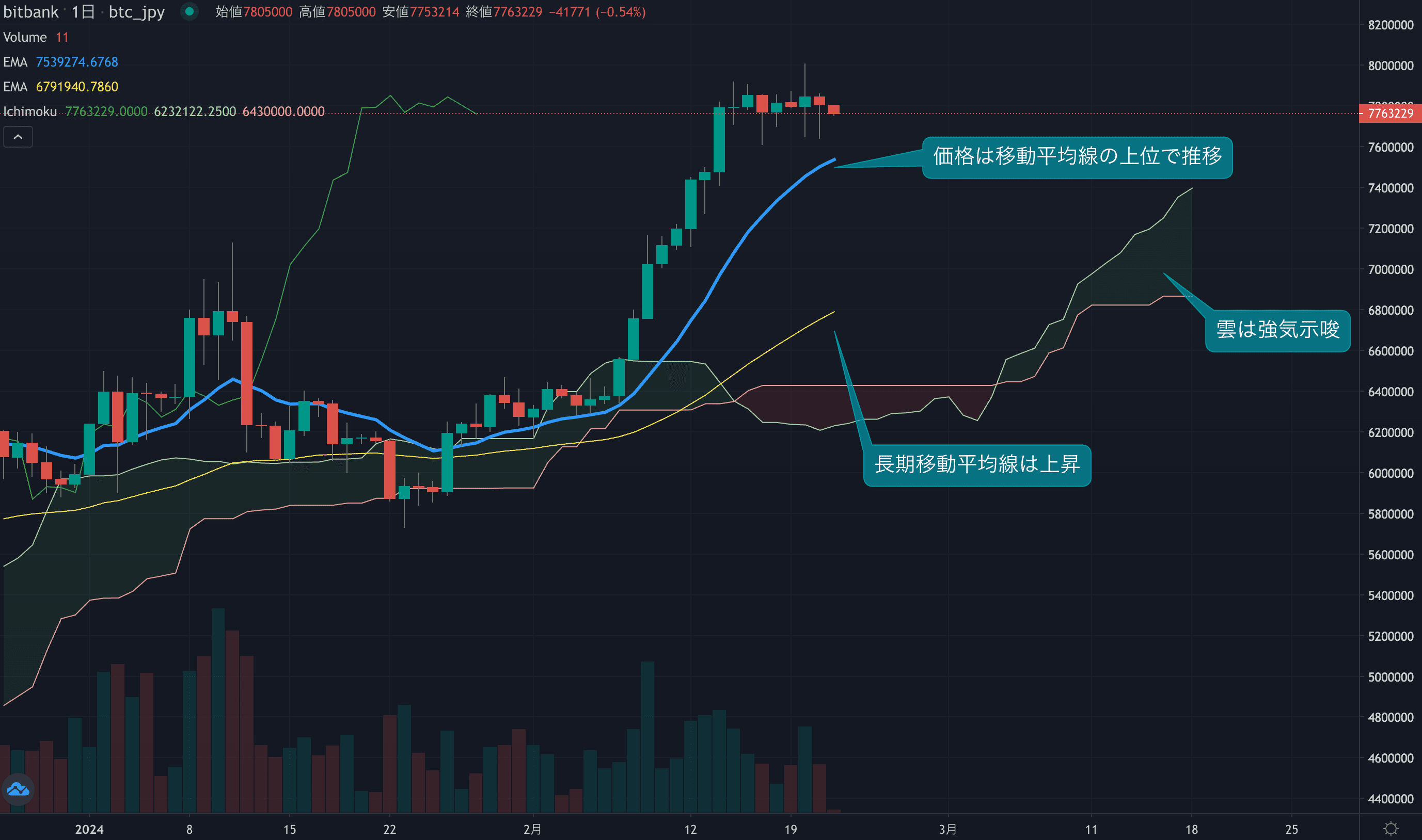 - 価格は14EMA(750.4万円)を上回り強気示唆です。53EMA(675.4万円)は上昇しており、長期トレンドも強気です。一目均衡表の雲は先行スパン1(735.4万円)が先行スパン2(686.8万円)を上回り強気示唆です。