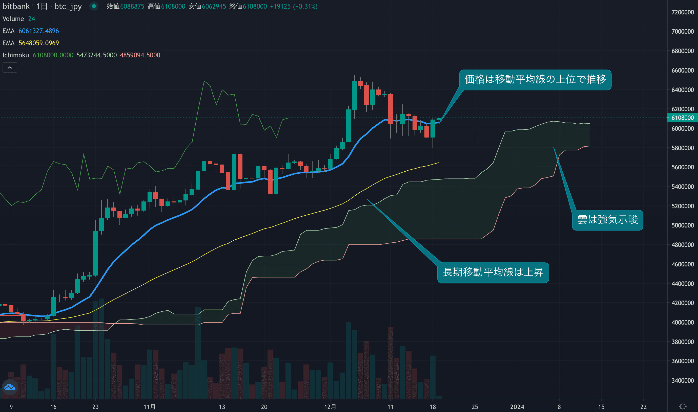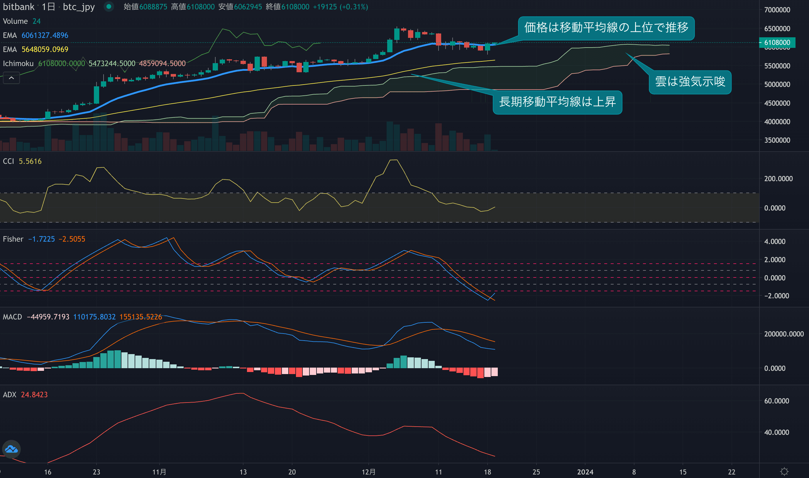 - 価格は14EMA(605.4万円)を上回り強気示唆です。53EMA(563.0万円)は上昇しており、長期トレンドも強気です。一目均衡表の雲は先行スパン1(605.4万円)が先行スパン2(581.0万円)を上回り強気示唆です。