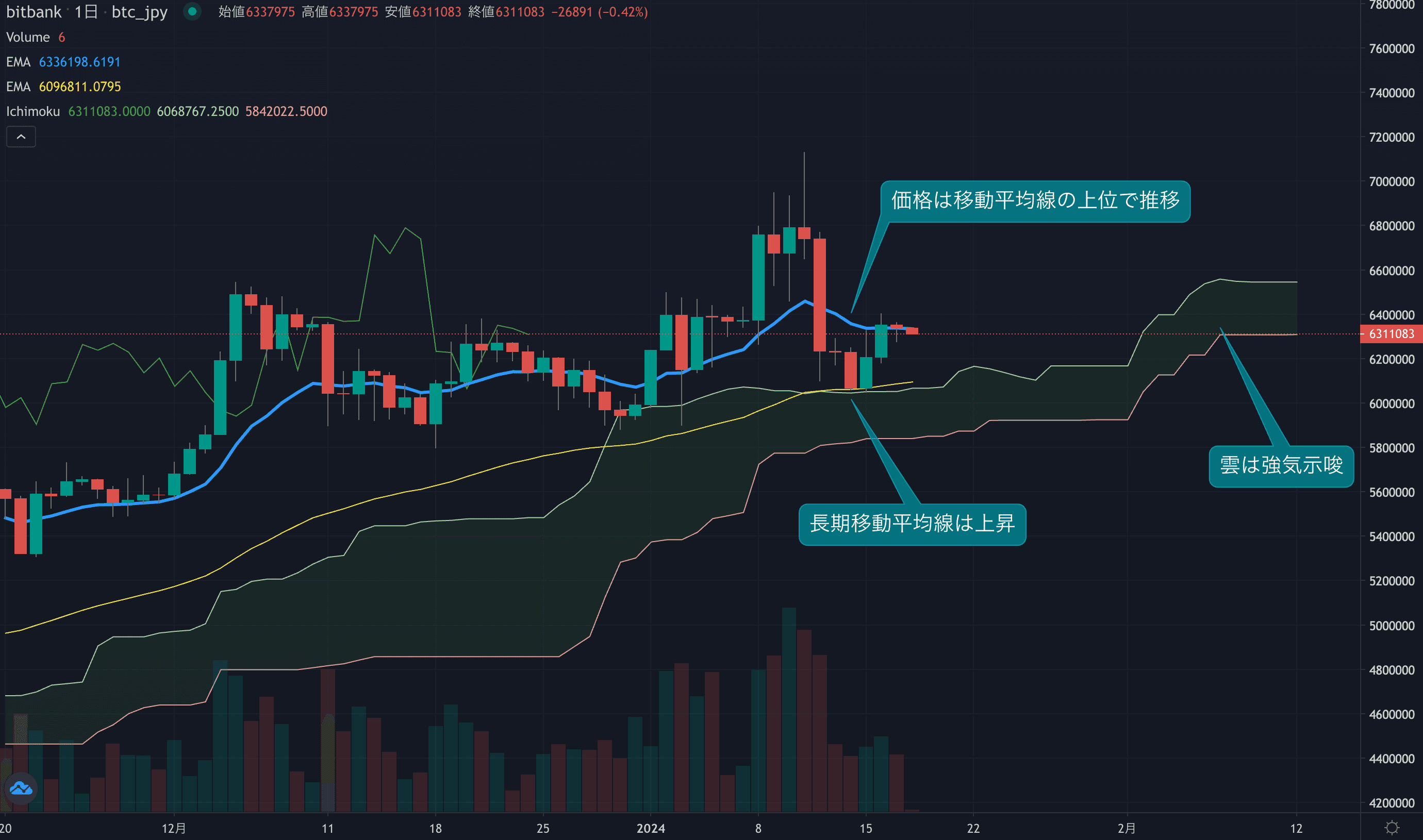 - 価格は14EMA(634.0万円)を下回り弱気示唆です。53EMA(608.8万円)は上昇しており、長期トレンドは強気です。一目均衡表の雲は先行スパン1(654.7万円)が先行スパン2(630.9万円)を上回り強気示唆です。