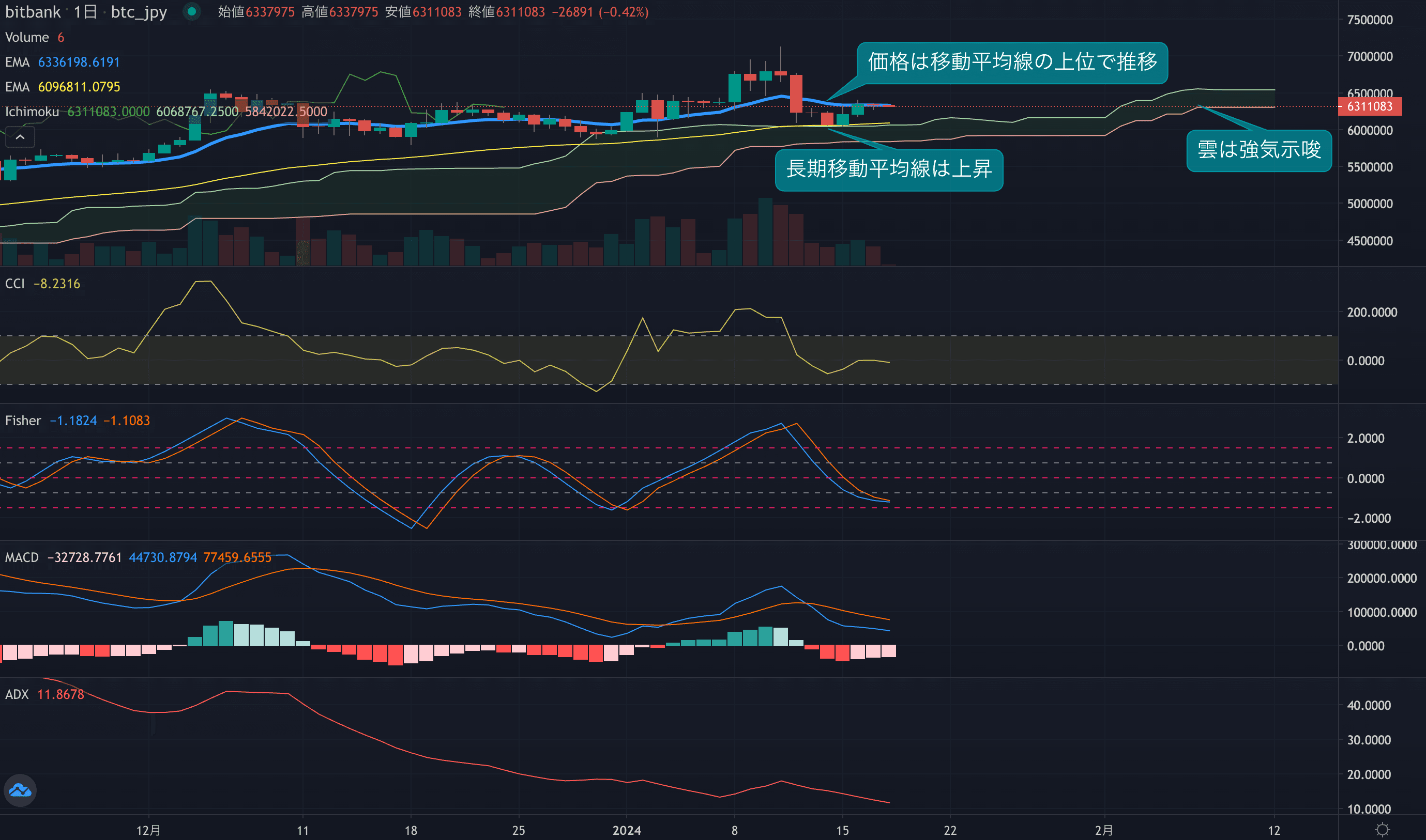 - 今週のビットコインは現在のところ週次で4%ほど上昇していますが、630万円台では上値が重くなっています。相場は動意に欠ける展開となり、ボラティリティは2022年10月以来の低水準となっています。この時はFTXショックが発生し、レンジを下に大きく抜けました。現在の相場はETF承認イベントを終え、買い売り共に材料がない状態となっています。今週は相場の調整局面入りが明確になっていますが、調整後は大きな値動きになりやすいため、買いと売りのポジション共に警戒が必要です。下落方向では引き続き600万年割れに注意です。