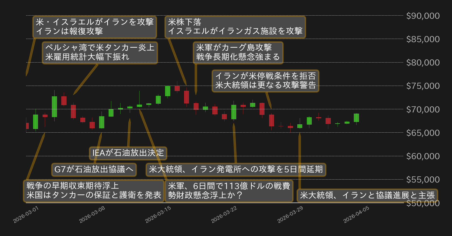下旬にかけては、米国が提示した停戦条件をイランが拒否したことで、米国が追加攻撃を警告するなど緊張が一段と高まった。これにより、BTCは一時6万5000ドル近辺まで下落したが、米国が攻撃延期やイランとの協議の進展を示唆したことで過度なリスクオフは後退し、6万ドル台後半でのもみ合いに転じた。