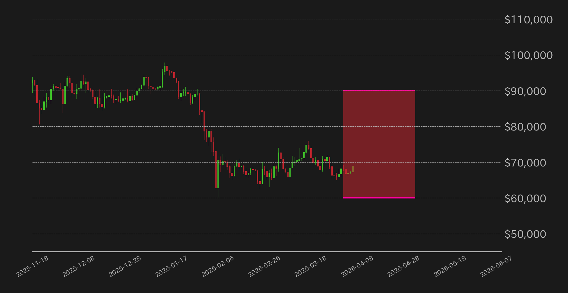 イラン紛争が限定的な衝突にとどまり、3月分の米インフレ指標も市場想定の範囲内に収まれば、BTCは底堅さを維持しつつ、6万〜7万7000ドルレンジでの推移が続くだろう。