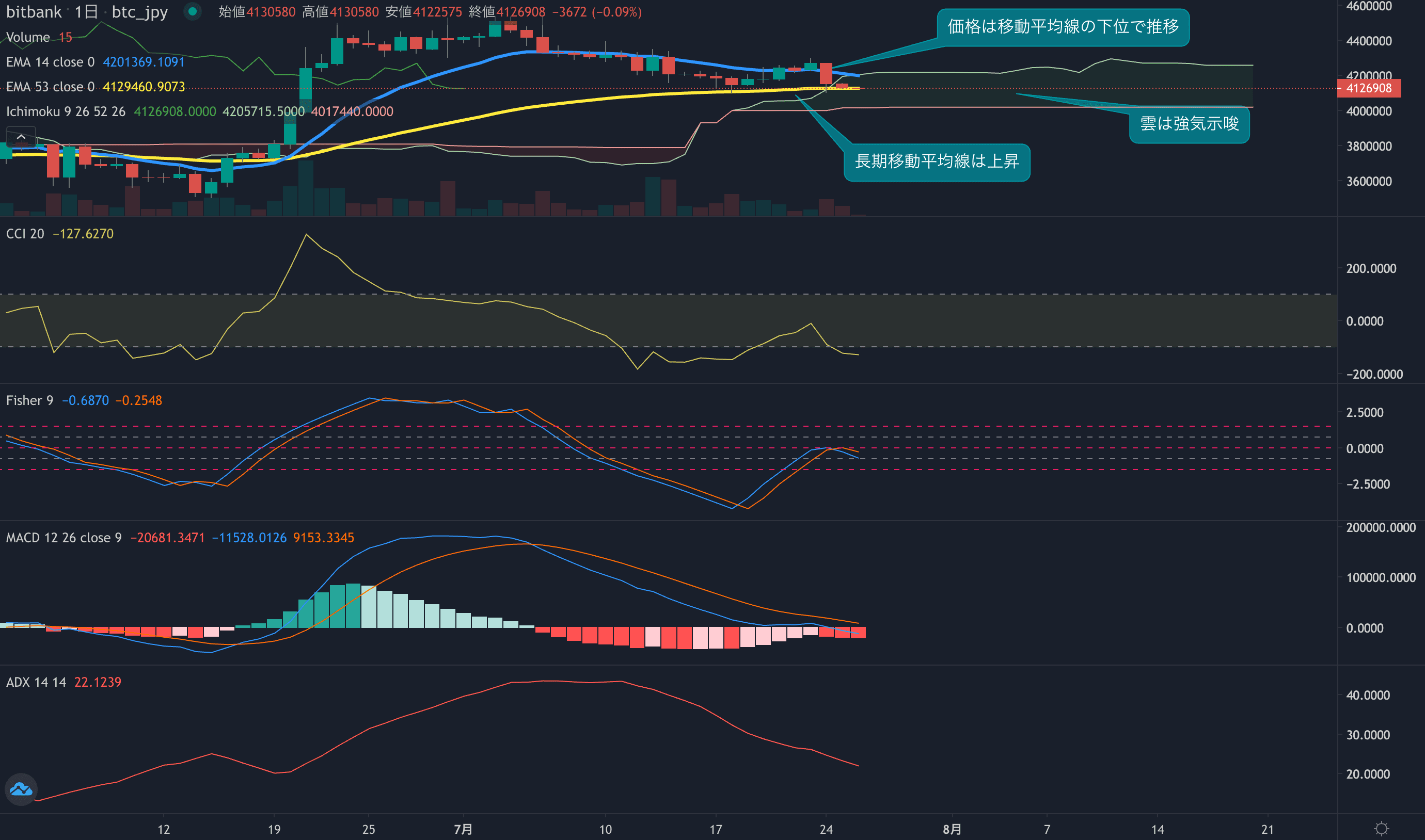 価格は14EMA(421.2万円)を下回り弱気示唆です。53EMA(412.9万円)は上昇中で長期トレンドは強気です。一目均衡表の雲は先行スパン1(426.0万円)が先行スパン2(402.1万円)を上回り強気示唆です。