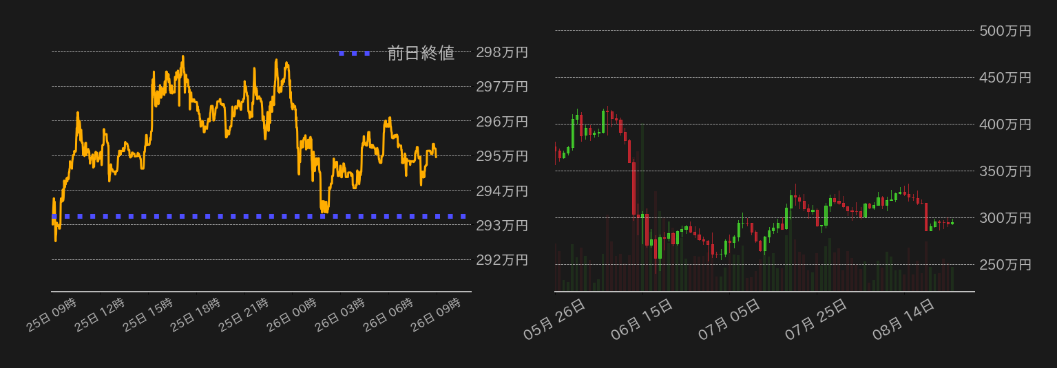25日のビットコイン(BTC)対円相場は290万円台での揉み合いが継続したが、終値ベースでは上昇し直近3日間の下げ幅の殆どを解消した。東京時間のBTC相場は、イーサ(ETH)対ドルの1,700ドル(≒232,312円)上抜けに連れ高となり298万円にタッチしたが、ジャクソンホール会議が始まる中、カンザスシティ連銀のジョージ総裁がインフレ抑制に向けて米連邦準備制度理事会(FRB)には「もっとやることがある」と積極的な利上げ姿勢を改めて表明すると、BTCは反落。米株の続伸に支えられる場面も見られたが、今朝方にセントルイス連銀のブラード総裁が、利上げの「前倒し(Front-Loading)」について言及すると、BTCは296万円で失速した。