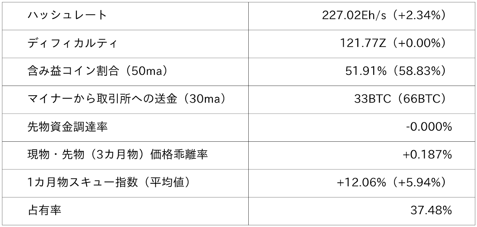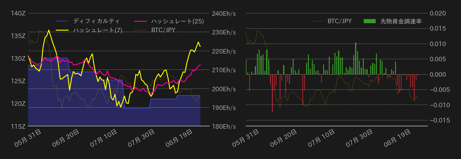 米労働市場の超過需要改善がなかったのはサプライズだったが、昨日はNY連銀ウィリアムズ総裁が来年の利下げ実施可能性が低いとの認識を示した割に市場の反応は限定的だったと言え、高金利政策長期化の織り込みが進んでいると言える。本日は集計方法刷新により6月分から停止されていた米Automatic Data Processing(ADP)の雇用レポートが公開され、今回は過去12年分の月次と週次のデータが一気に公開されることから、市場の注目度も高いだろう。労働需給の逼迫が示唆されれば、金曜日の雇用統計に向けて警戒感が強まると指摘されるが、BTCのハッシュレートは引き続き堅調に推移し、先物資金調達率からは売り疲れ感も出ており、相場は強弱材料で綱引きが続くだろう。