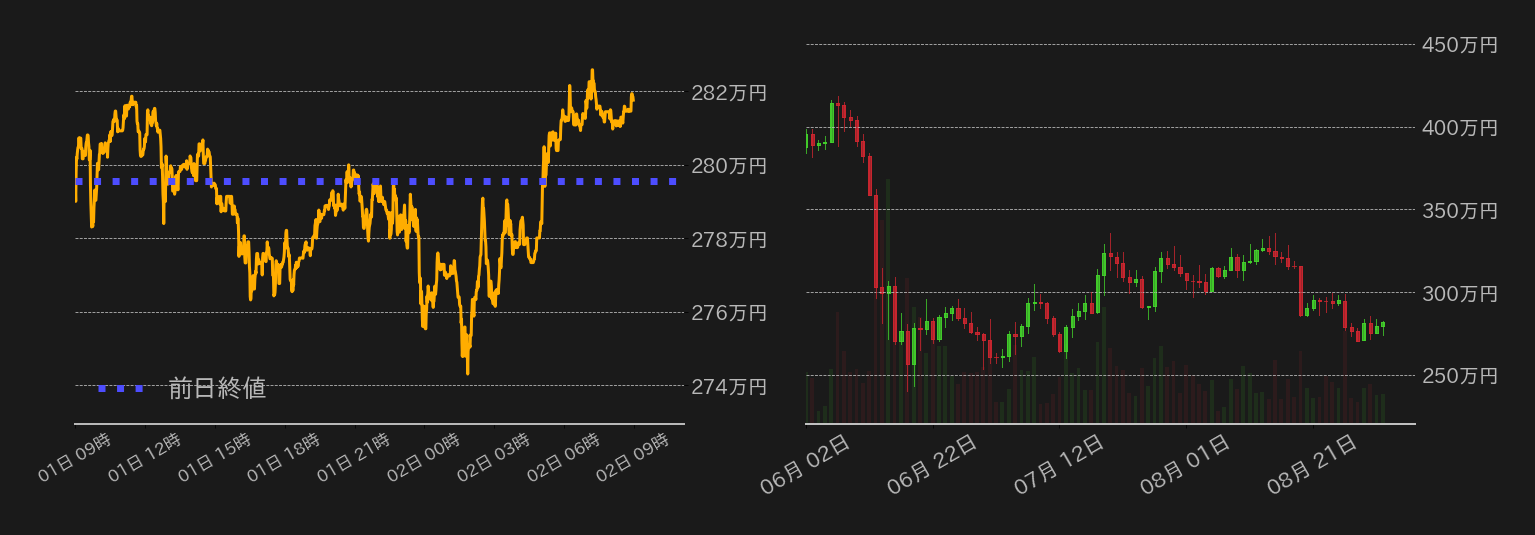 9月1日のビットコイン(BTC)対円相場は270万円〜285万円レンジ内で推移し、対ドルで節目20,000ドル水準となる280万円を挟み込む展開が続いている。280万円周辺から小甘い展開で始まった昨日のBTC相場だったが、米国の新規失業保険申請件数減少と8月のISM製造業雇用指数の改善を受けて、①本日の米雇用統計が強めに出る懸念と、②それによる米連邦準備制度理事会(FRB)の政策引き締め余地拡大で、BTCはやや下げ足を速め274万円近辺まで押した。一方、ディフェンシブセクターを筆頭に米株が反転すると、BTCも連れ高となり今朝方に下げ幅を奪回。20,000ドル水準を維持した。