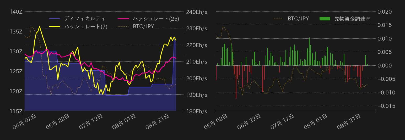 FRBのタカ派的な政策維持が濃厚となる中、BTC相場は底堅かった。前日には大幅なディフィカルティ上方調整があったにも関わらず、ハッシュレートもある程度の高水準を保っている。ただ、8月の米雇用統計発表を目前にBTCオプションのスキュー指数(1カ月限の25デルタのコールとプットのIV差)が昨日は上昇し15%を超えた。これは、BTCオプション市場の需要がプットに偏る状態となっていることを示唆し、目先の相場値下がりを織り込んでいることとなる。市場では、7月から雇用拡大ペースと賃金上昇ペースが鈍化することが予想されているが、ネガティブサプライズにも対処できるよう、身構えておく必要があるだろう。