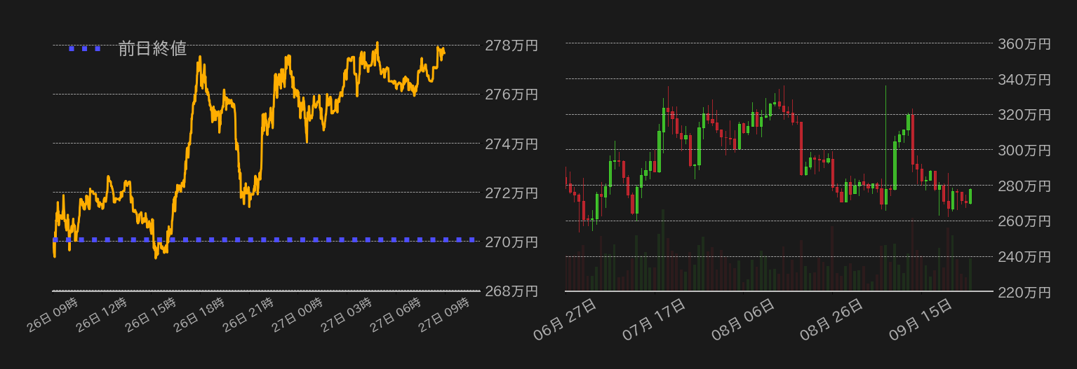 26日のビットコイン(BTC)対円相場は反発し、先週の米連邦公開市場委員会(FOMC)後の下げ幅をほぼ奪回した。外国為替市場でポンドが対ドルで最安値を更新し、市場に動揺が走ったが、東京時間のBTCは小さく揉み合いに終始。欧州株が上昇して取引を始めると連れ高で19,000ドル水準(≒275万円)を回復したが、株価がすかさず下げに転じるとBTCも278万円付近で上値を抑えられた。もっとも、英国の緊急利上げが囁かれる中、ベイリー英中銀総裁が利上げを見送ったことや、ボストン連銀のコリンズ総裁がインフレが既にピークを迎えた可能性に言及したことで、BTC相場は底堅く推移した。