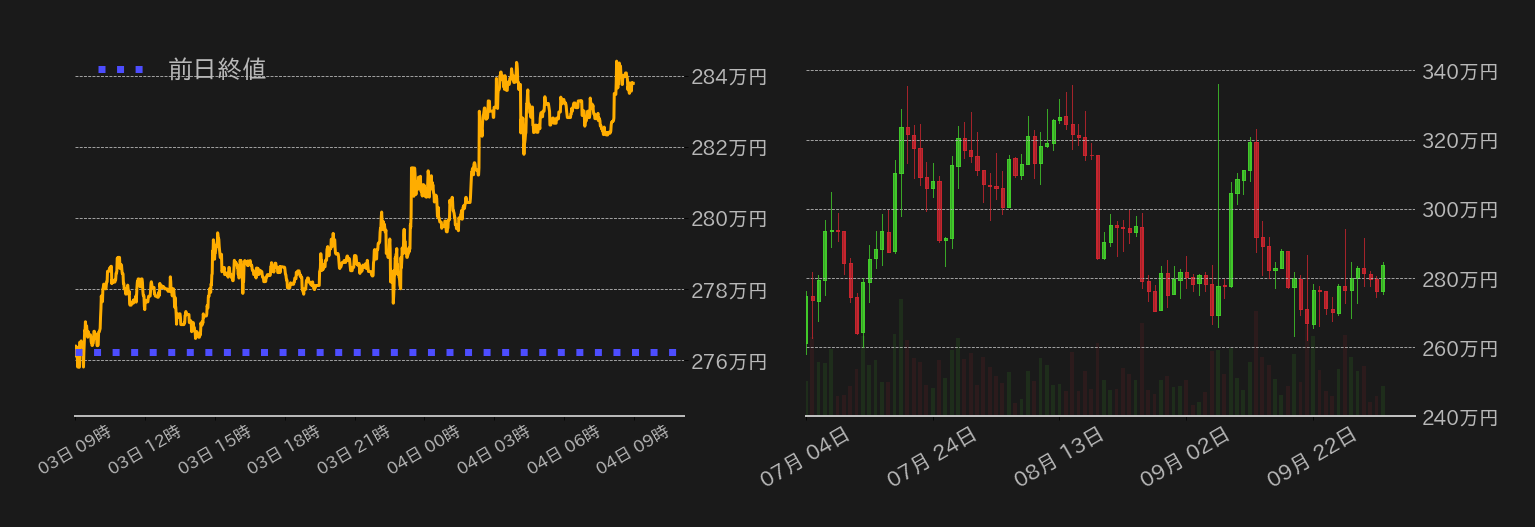 3日のビットコイン(BTC)対円は4日ぶりに反発し280万円を回復した。シカゴマーケンタイル取引所(CME)のBTC先物取引再開を期に不安定な値動きで始まった今週のBTC相場は、昨日東京時間に19,000ドル水準(≒275万円)割れを試す場面も見られたが、米長期金利の上昇一服を受け米株先物が下げ渋り、節目の水準を維持した。海外時間に入ると米長期金利は英国債利回りの低下に追随。更に、ISMの9月PMIが50.9と景気減速との分かれ目ギリギリの水準になったことや、支払価格など各指数も前月から低下したことで、積極的な金融引き締めが緩むとの思惑から長期金利は一段と水準を下げ、BTCは米株に連れ高となる格好で280万円の上抜けに成功した。