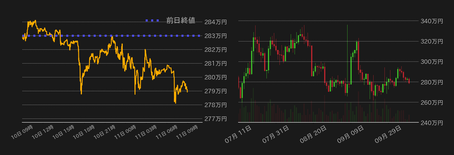 7日の米雇用統計で非農業部門雇用者数変化が市場予想を上回り、失業率が改善したことを受け、米連邦準備制度理事会(FRB)が引き続き積極的な利上げを継続するとの思惑から、ビットコイン(BTC)の対円相場は290万円周辺から280万円周辺まで押し週前半の上げ幅を縮小。週末には280万円台前半で下げ止まるも、三連休最終日には祝日明けの中国市場で株価が下落しBTCも上値を重くすると、米時間にはバイデン政権が半導体の対中輸出規制拡大を発表し、米ハイテク株を筆頭にリスクオフがBTCにも波及。相場は今朝方に280万円を割り込み、対ドルでは19,000ドル(≒276.8万円)割れを試す展開となっている。