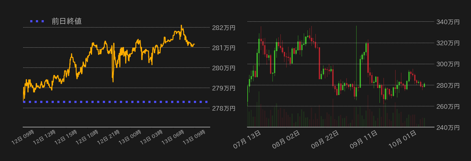 12日のビットコイン(BTC)対円は反発し280万円を回復。BTC対ドルは小幅揉み合いに終始したが、対円相場は外国為替市場で円がドルに対して下落したことで恩恵を受けた。GoogleとBNYメロンの業界参入で11日のBTC相場は270万円台後半で下げ渋ると、昨日の東京時間からはジリ高で戻りを試した。BTCの対ドルは19,200ドルを背に揉み合いとなったが、ドル高円安の加速で対円相場は280万円を回復。9月米卸売物価指数(PPI)が市場予想を上回りその後は失速するも、米連邦公開市場委員会(FOMC)議事要旨で何人かの参加者が「経済への影響を考慮して金融引き締めペースを調整するべき」と指摘したことを好感し、相場は持ち直した。