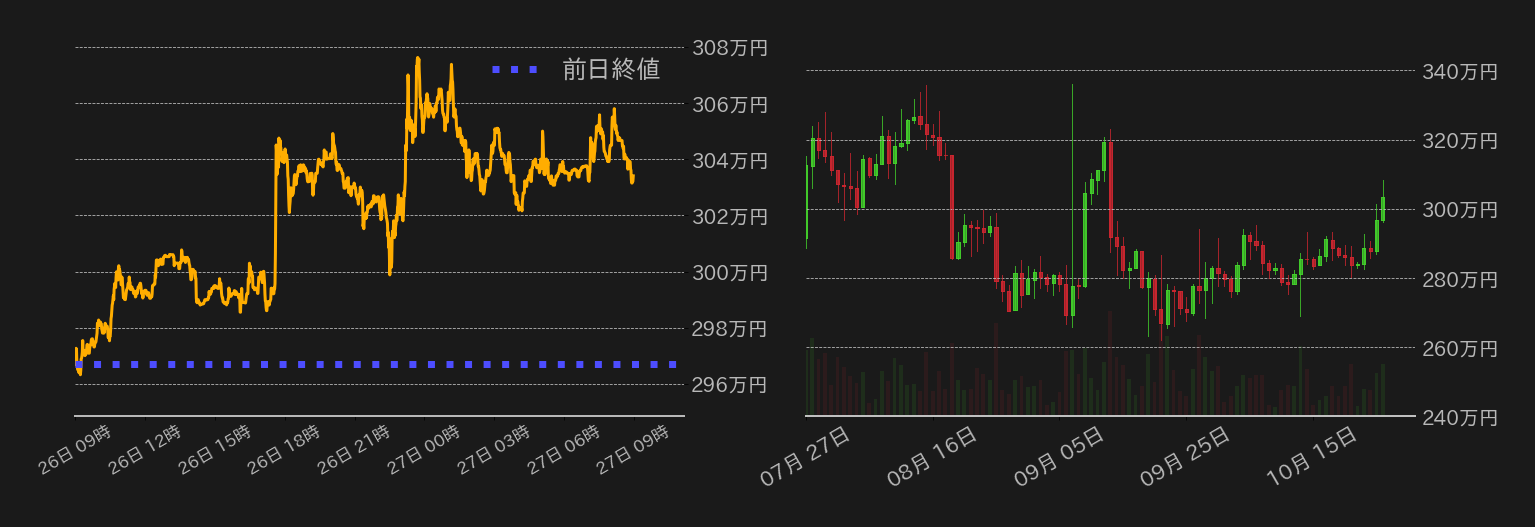 26日のビットコイン(BTC)対円相場は2日続伸し、終値で300万円を回復。対ドル相場は20,000ドル(≒292万円)台を維持した。アジア株式市場の反発を追い風にこの日のBTC相場は東京時間か300万円乗せをうかがい小確りと推移すると、欧州時間の米国債利回り低下に追随したユーロドルのパリティ回復と同時に一段高を演じ明確に300万円台に乗せた。米連邦準備制度理事会(FRB)が12月の連邦公開市場委員会(FOMC)から利上げペースを減速させるという観測はこの日も続き、米長期金利はNY市場でもう一段と下げ、節目の4%割れをうかがう展開となり、BTCは21,000ドル(≒308万円)にワンタッチ。ただ、アルファベット、マイクロソフト、メタ(旧フェイスブック)の決算が振るわず米株が反落すると、BTCも失速し、足元、304万円周辺で推移している。